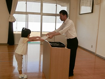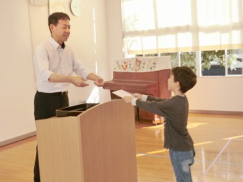 今日は朝の集会があり、みんなで幼稚園歌を歌った後、園長からお話をしました。その後の表彰では、絵の具画の表彰も行いました。入賞、おめでとうございます!