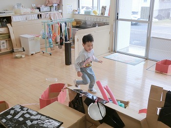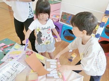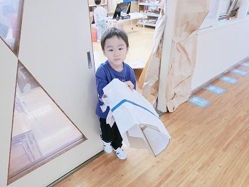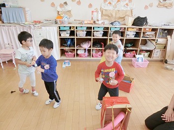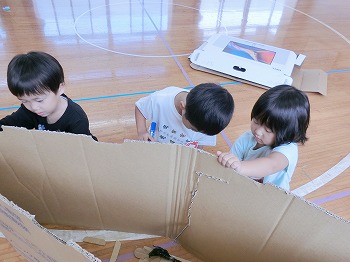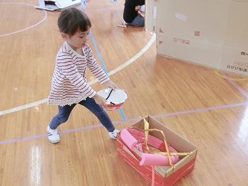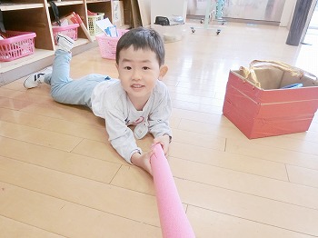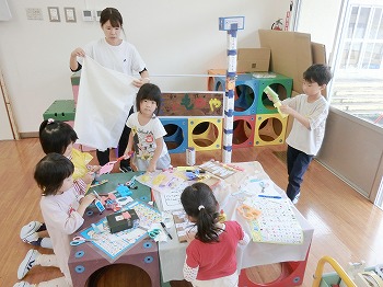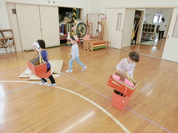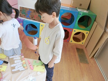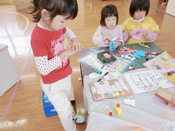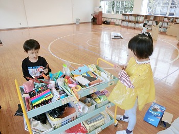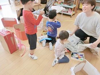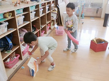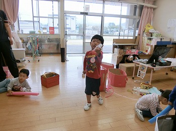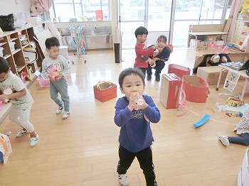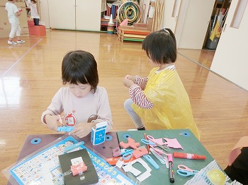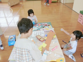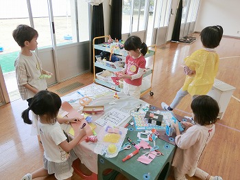 今日の朝活動の様子です。もも組さんは、救急車・消防車で走り回り、放水ごっこを楽しんでいました。きく・ばら組さんは、お店屋さんごっこに向けて製作に励んでいました。集中している様子でとてもがんばっていました。
