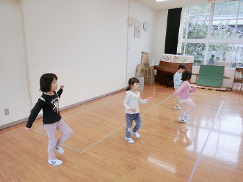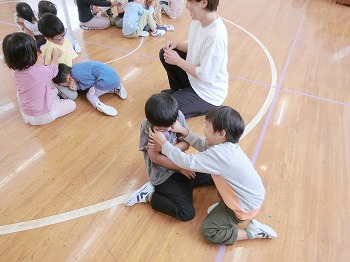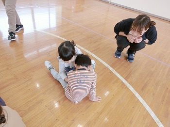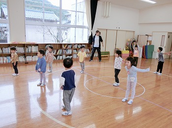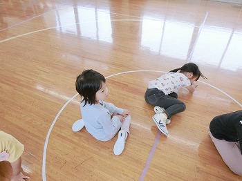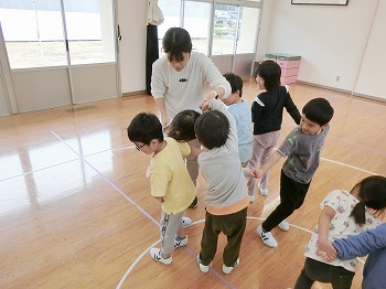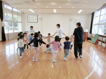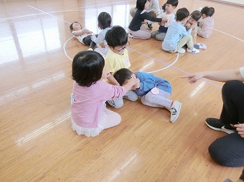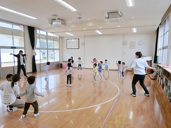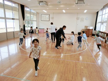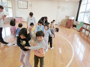 指導主事訪問(保育公開)の続きです。活動の最後は、全員で交流して遊ぶハッピータイムでした。最初に、リズム「ラララ体操」で運動して体を温めました。次にふれあい遊びを楽しみました。子どもたちは、リズムもふれあい遊びも大好きで笑顔いっぱい大歓声で遊んでいました。これからも、13人仲良く楽しく活動してくださいね!