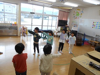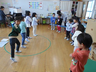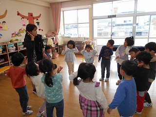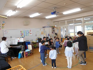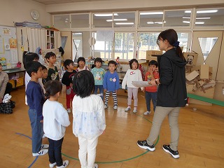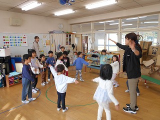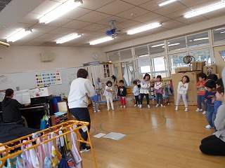 11月29日(土)の発表会に向けて練習が始まりました。劇は全園児一緒に取り組みます。今日は劇の中で歌う歌を練習しました。歌詞に合わせて振り付けをすると、もっと素敵になることに気付き、みんなでアイデアを出しながら練習しました。覚えるのが早く、「きく組先生」になって年下の子をリードする場面もありました。