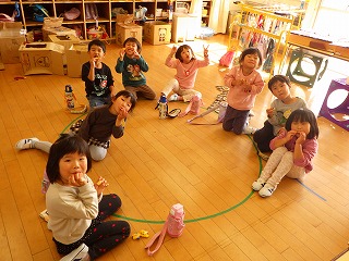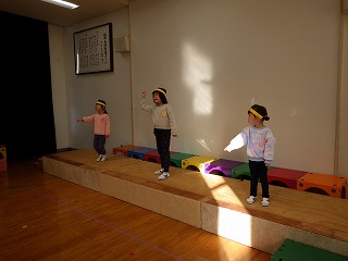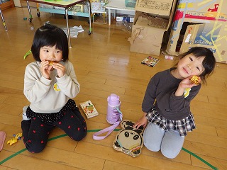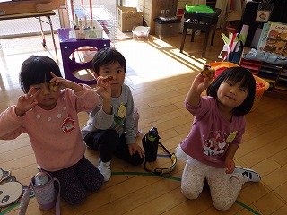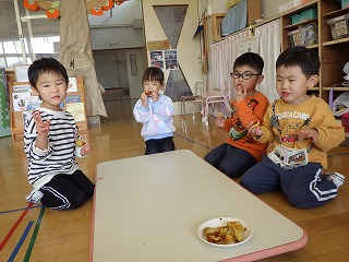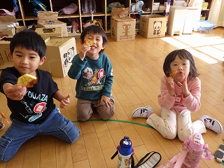 みんなで劇の練習をしました。歌に合わせて振りを付け、表現遊びを楽しみました。練習の後は、ホットプレートで焼いたサツマイモのおやつをみんなでいただきました。