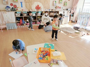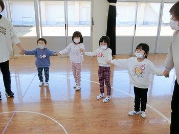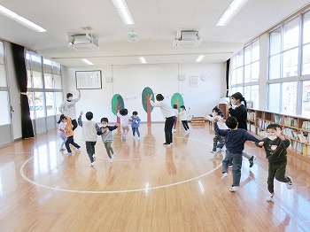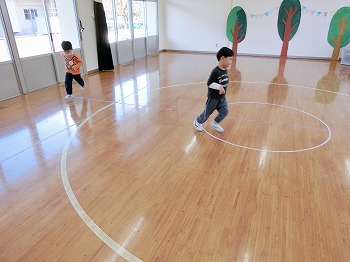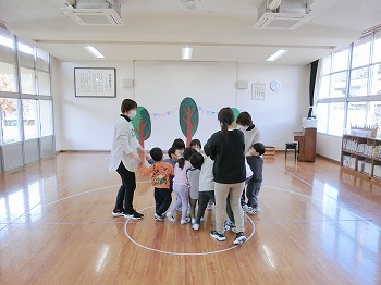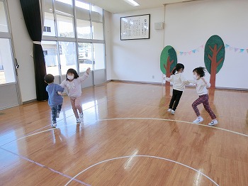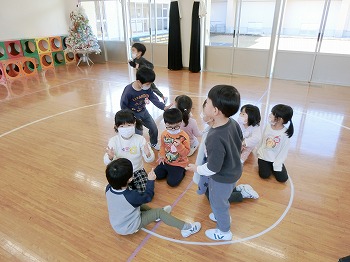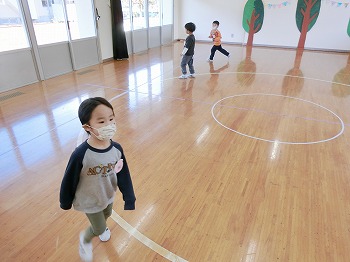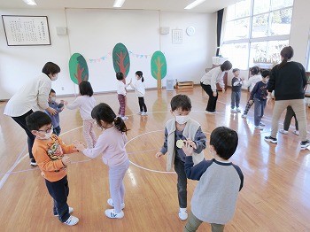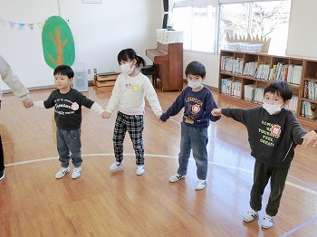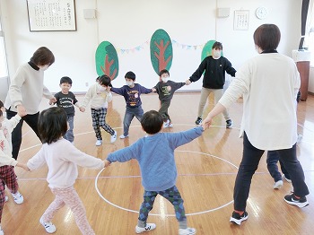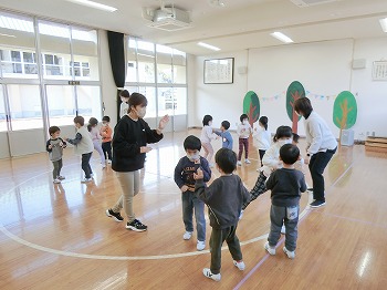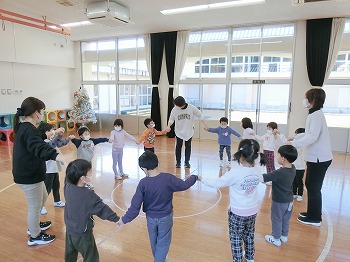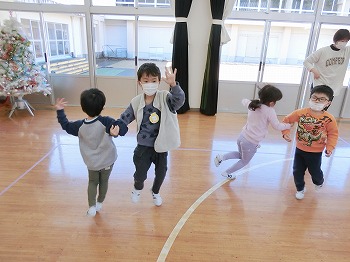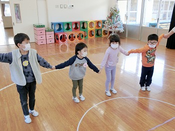 今日は、ハッピータイムで「ジングルベル」のリズム遊びをしました。回ったり、ぎゅっと集まったりして、とっても楽しそうで歓声が絶えず、見ていて微笑ましかったです!