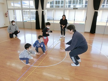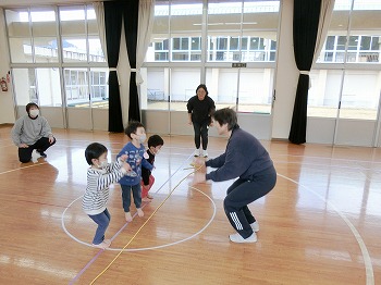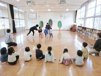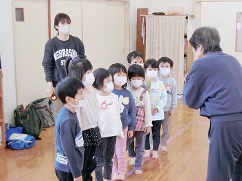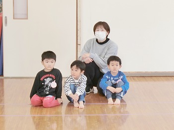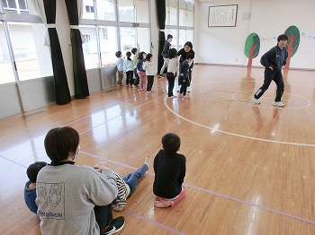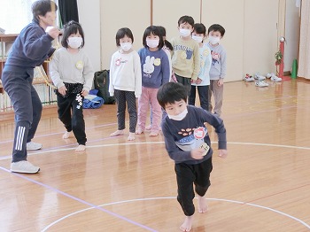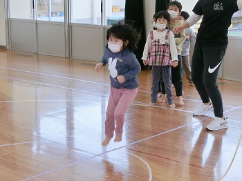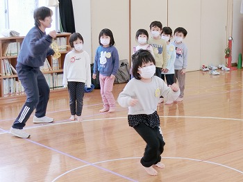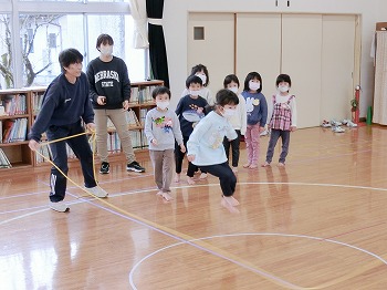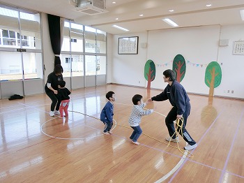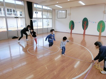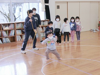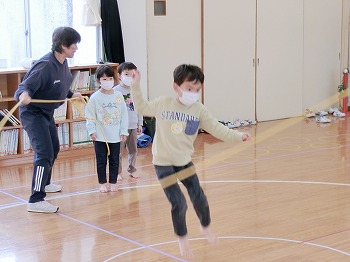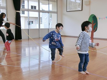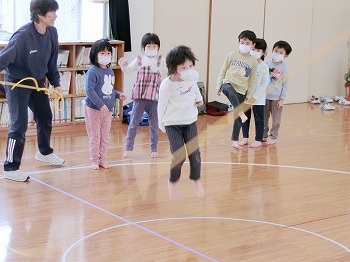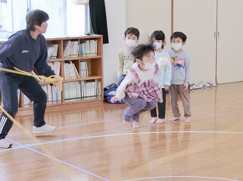 今日は、講師の先生をお迎えして、運動教室を開いていただきました。もも組さんは、大なわの基本的な跳び方をスモールステップで体験しました。きく・ばら組さんは、8の字回旋跳びの指導を受けた後、50回跳びに挑戦していました。楽しい雰囲気の中で一生懸命に取り組む姿が大変微笑ましかったです!