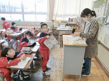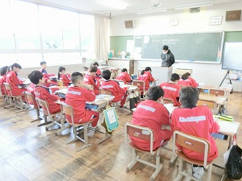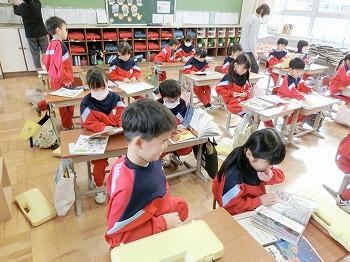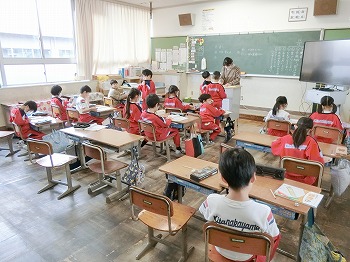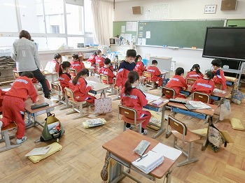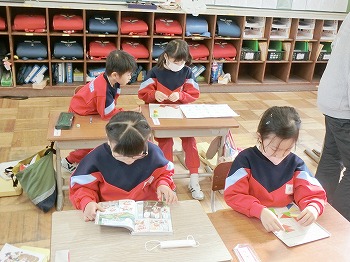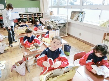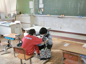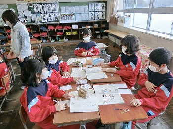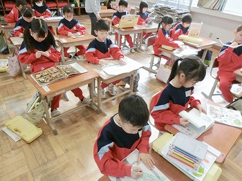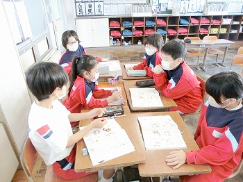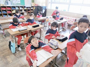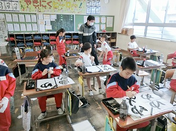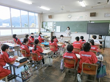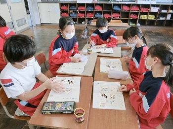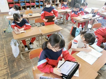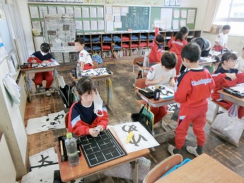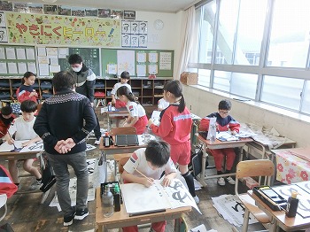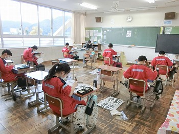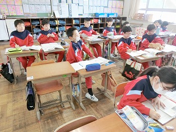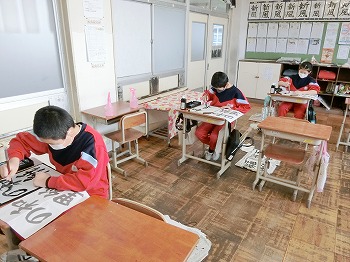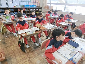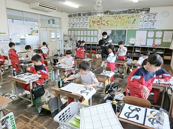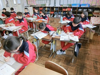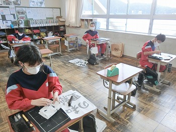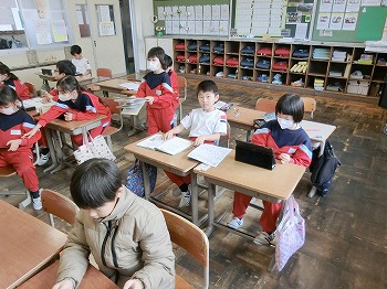 今日の授業風景です。4年生は、国語でグループごとに正月かるたを分担して製作していました。1年生は、音楽で教室でピアニカのテストをしていました。どの学級も落ち着いて学習ができていました。