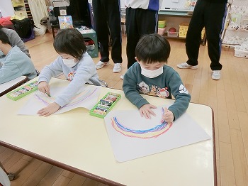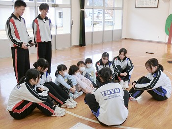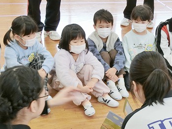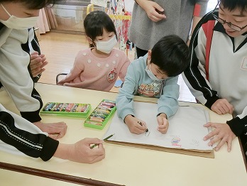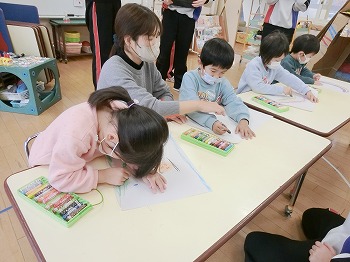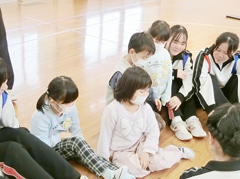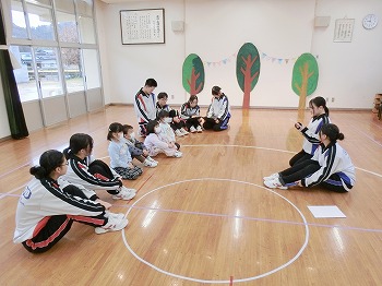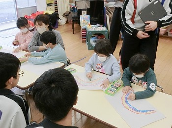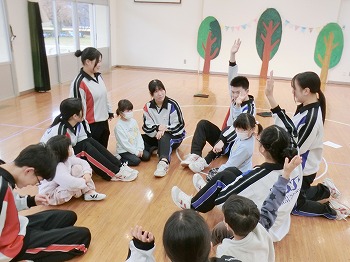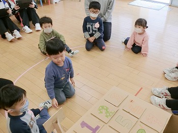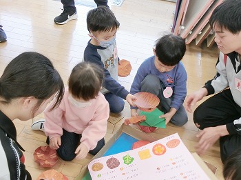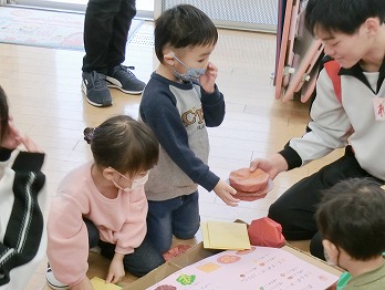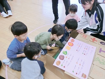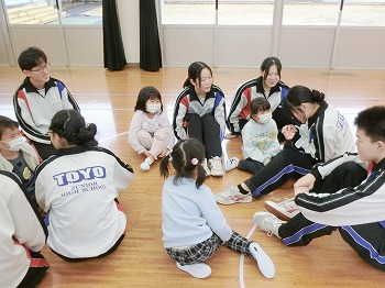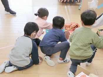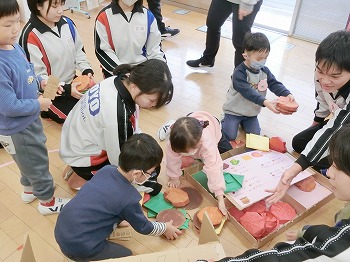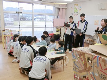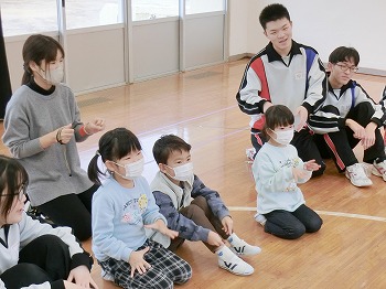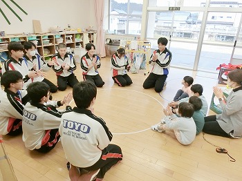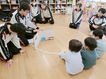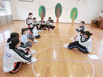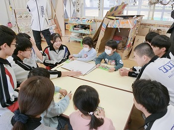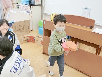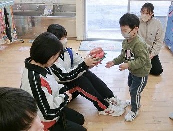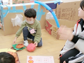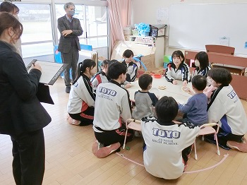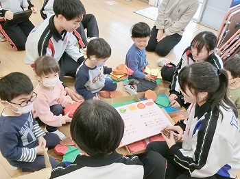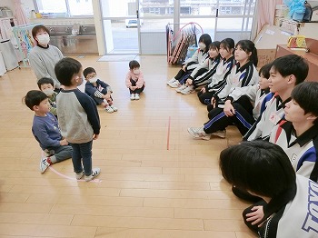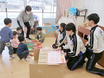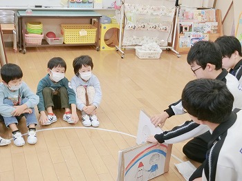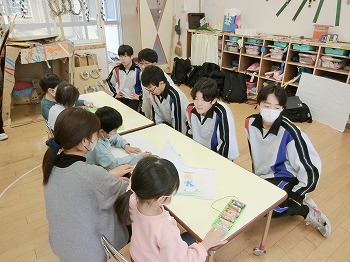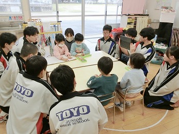 今日は、東陽中3年4組の生徒が家庭科実習で北中山幼稚園に来ました。いつものように絵本を読んでくれたり、しっかりと自作した遊び道具で遊んだりして園児たちを楽しませてくれました。最初のあいさつも含めて、中学生と子どもたちのやりとりがとても微笑ましかったです!また、今日もどのグループの中学生も笑顔でやさしく接してくれてとっても良かったです!東陽中3年4組の皆さん、楽しい時間をありがとう!