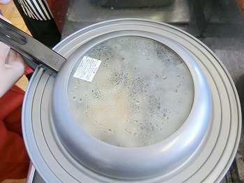 フライパンを前後に頑張って動かしています!