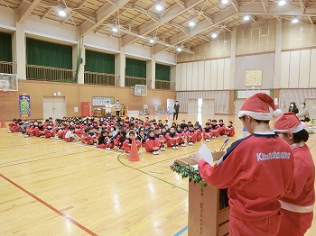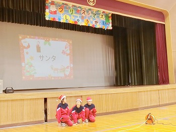 今日は、6年生がクリスマス集会をしてくれました。前半は体育館でクリスマスの歌、クイズ、ゲームで楽しみました。特にクイズで大盛り上がりしていました。6年生のみなさん、楽しい時間をありがとう!