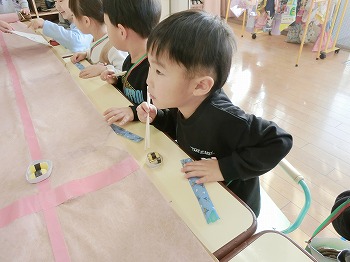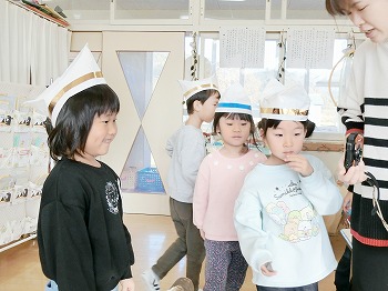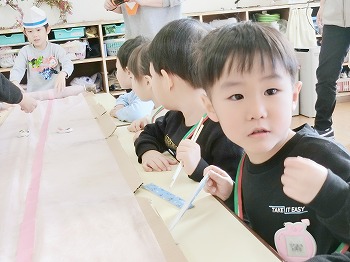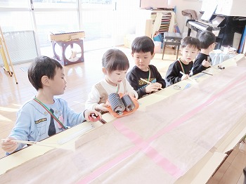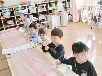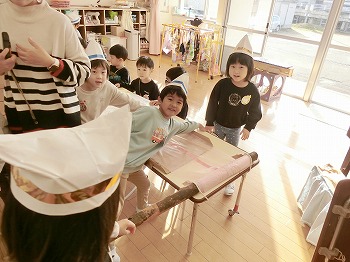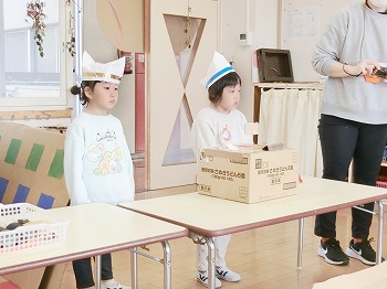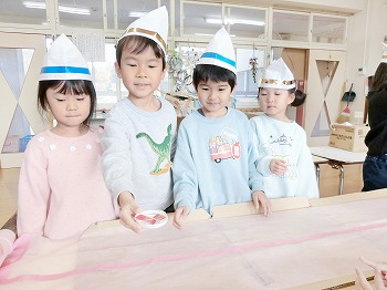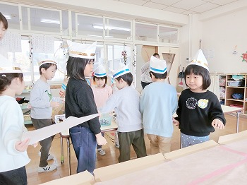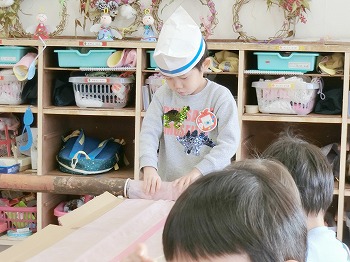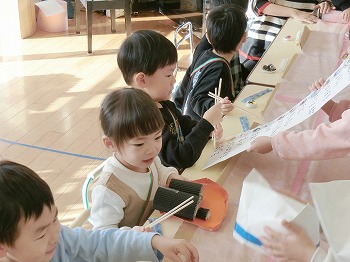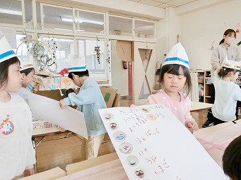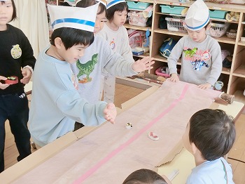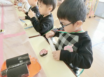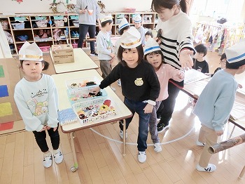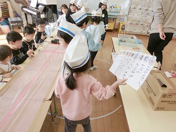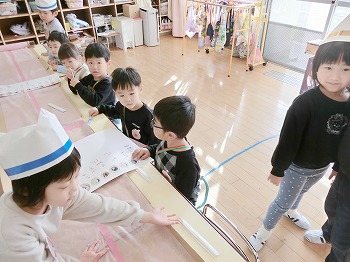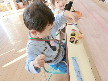 今日はきく・ばら組さんが、もも組さんと私(園長)を招待してお寿司屋さんを開いてくれました。たくさんメニューがあり、注文すると手動レーンで運ばれてきて、お寿司屋さんらしいとっても楽しい雰囲気でした。きく・ばら組さんは、役割分担して仕事をてきぱきこなしていて良かったです。もも組さんを注文したお寿司が届くと、とても喜んでいました。きく・ばら組さん、とっても楽しいお寿司屋さんをありがとう!(2に続く)