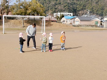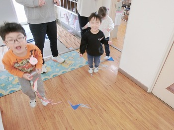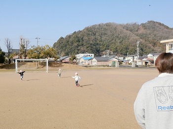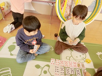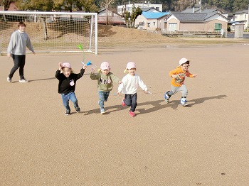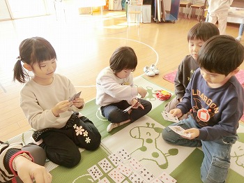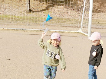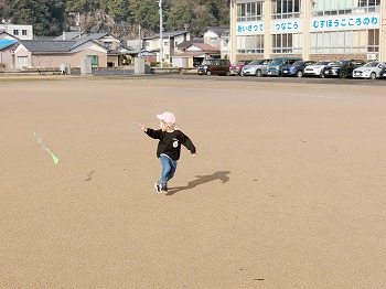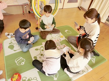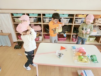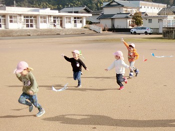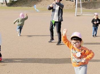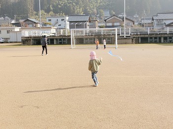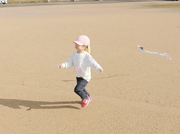 今日の朝活動の様子です。きく・ばら組さんは、製作や七並べのトランプ遊びをして楽しんでいました。もも組さんは冬の青空の下、小学校の校庭で自作のたこ上げをしていました。東西に一生懸命走る様子が微笑ましかったです!