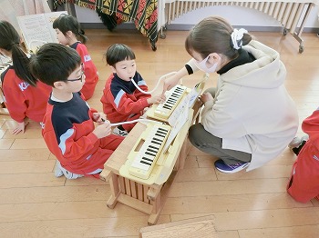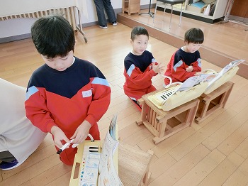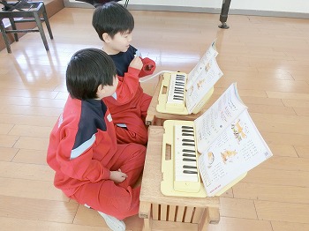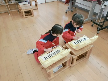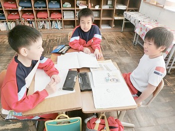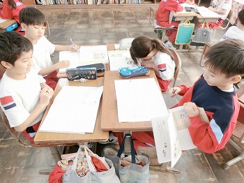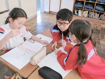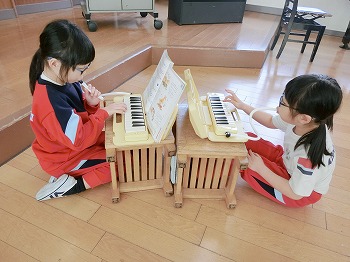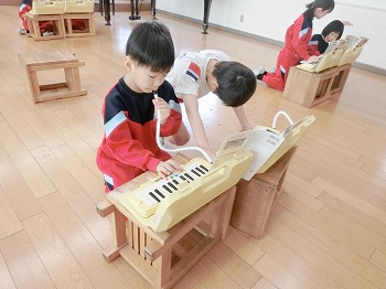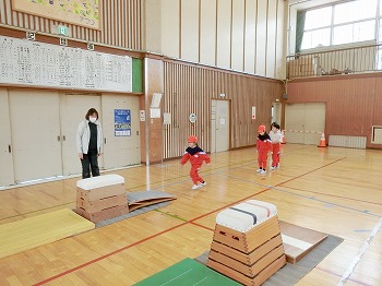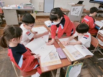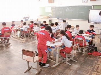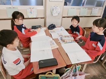 今日の授業風景です。1年生は、体育で跳び箱の跳び方確認をしていました。3年生は、道徳で班で意見を出し合っていました。2年生は、音楽でピアニカをペアで取り組んでいました。
