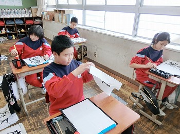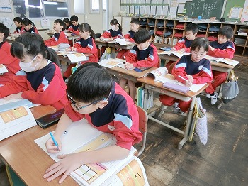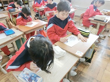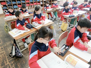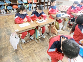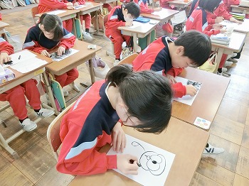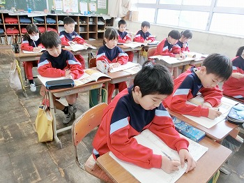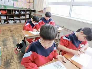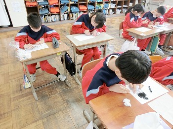 今日の授業風景です。3年生は、道徳で「友達がいて良かったこと」を考えていました。2年生は、音楽できれいな合唱を響かせていました。4年生は、理科で実験準備をして気を付けることについて考えていました。6年生は、書写で「感謝」をすごく集中して書いていました。5年生は、図工で木炭棒だけで絵を描く練習をしていました。1年生は、体育で1分間の後ろ跳びを計っていました。この調子で、学習に集中しましょう!