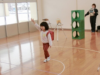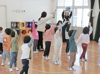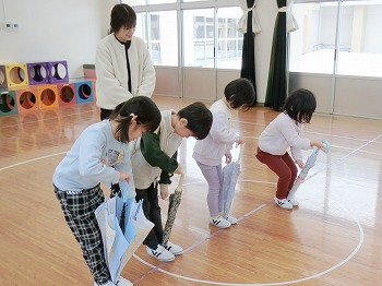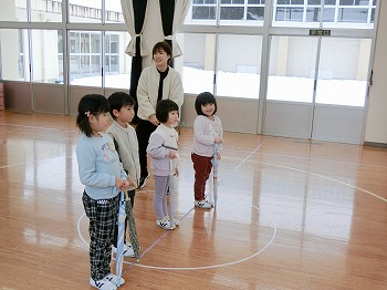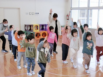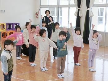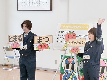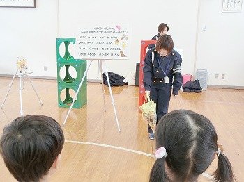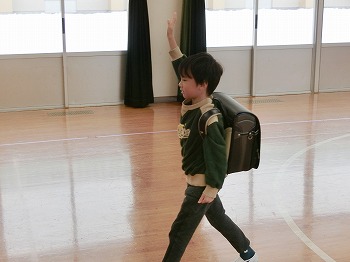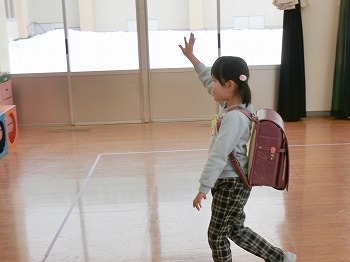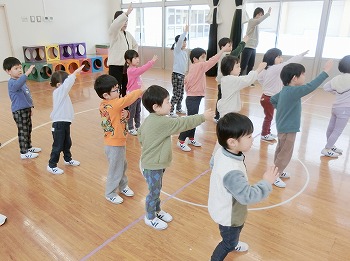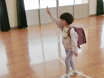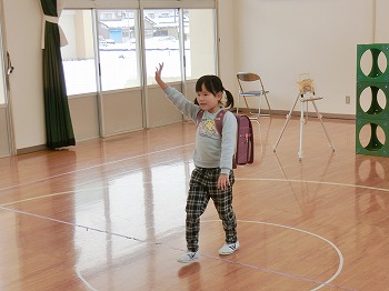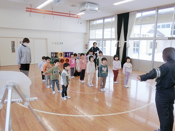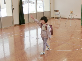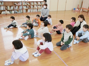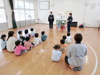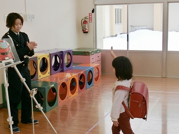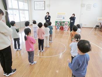 今日は交通安全協会の皆さまを講師にお迎えして、交通安全教室を行いました。冬の雪道や傘さしの注意点、横断歩道の渡り方について丁寧に教えていただきました。最後はおやくそく体操を教えていただき、全員で歌に合わせて体操をしました。きく組さんはその後、小学生の集団登校に向けて実際にランドセルを担いで横断歩道を歩く練習をしました。とっても上手にまっすぐ歩けていて、褒められて良かったです!今日学んだことをご家庭でも話題にしていただき、日常生活でしっかり守っていってくださいね!