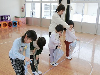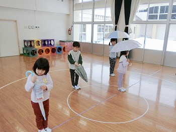 きく組さん、傘の閉じ方練習!