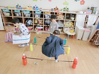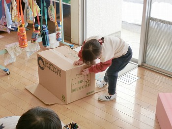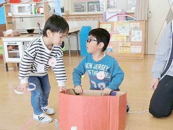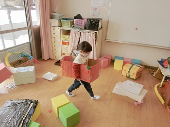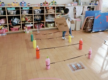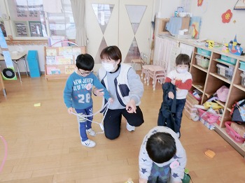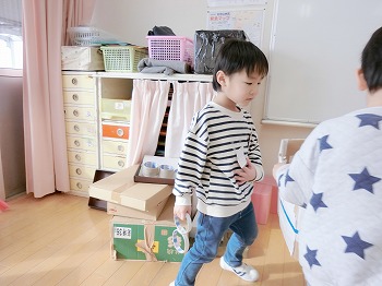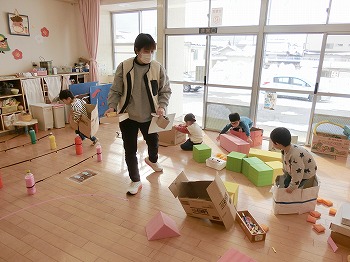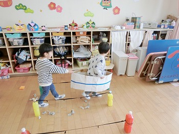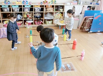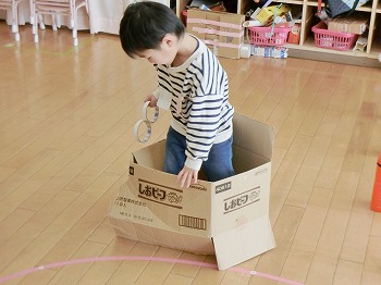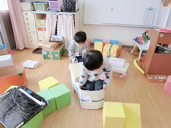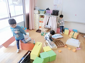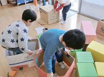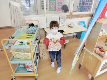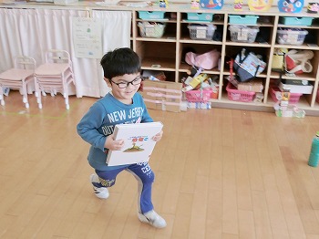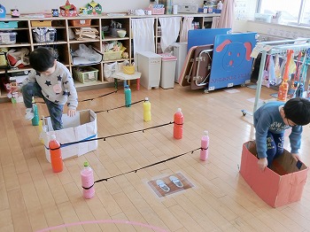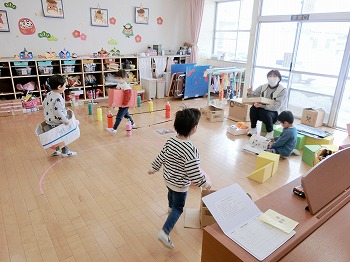 今日の朝活動の様子です。もも組さんは、自動車ごっこで遊ぶ子が多く、救急車の人気が高かったです。消防車を運んでくれるようなやさしい姿や自作の警察・消防バッジもアピールする姿が見られて、大変微笑ましかったです!