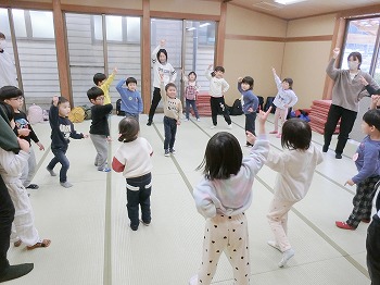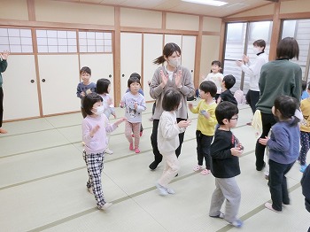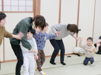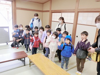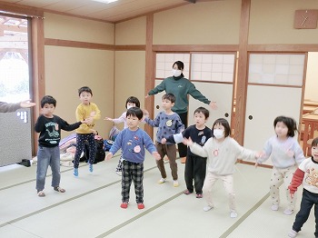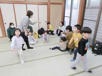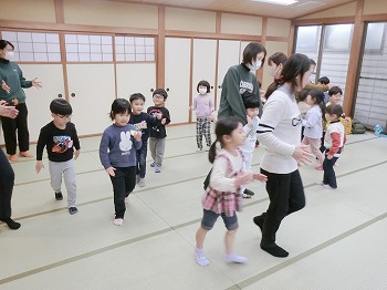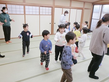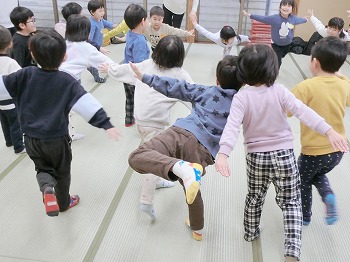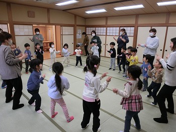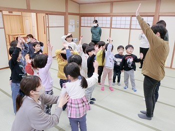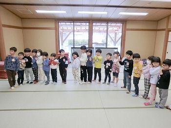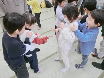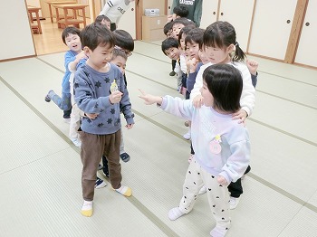 片上幼稚園とのわくわく交流の続きです。子どもたちは、これまでのいろんな一緒の活動の経験から片上の子の名前を覚えている子もいて(片上幼稚園の子も同様だったようですが)、今日の日を楽しみにしていました。お互い少人数同士の園なので、子どもたちも接しやすい環境だったようです。交流遊びでも、とても楽しく笑顔で遊ぶ様子がたくさん見られました。これからも、2園での交流を深めていきましょう!