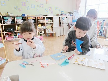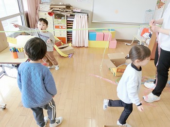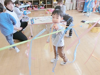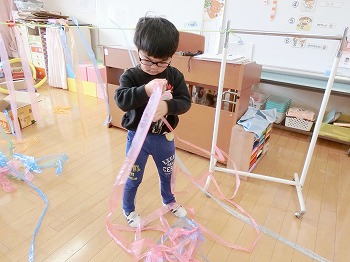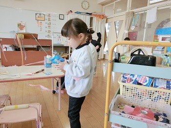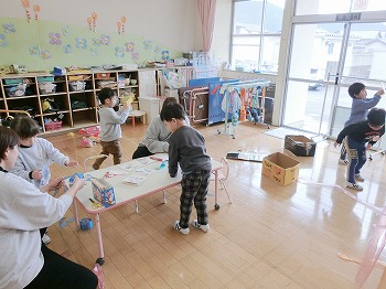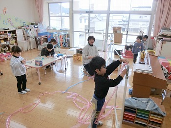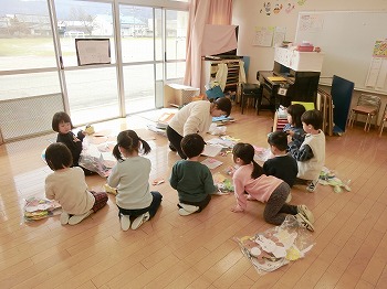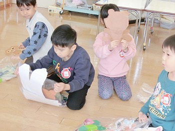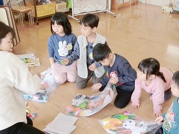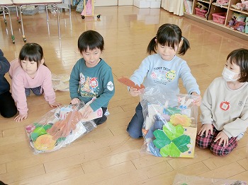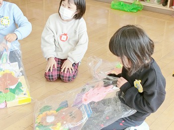 今日の朝活動の様子です。修了式の練習後、きく組・ばら組さんはこれまでの製作物を袋に入れていました。お家でぜひ1つ1つ確認して、話題にしてみてください!もも組さんは、自ら選んだ遊びをしていました。こちらもぜひ何をしているところなのか、話題にしてみてください!