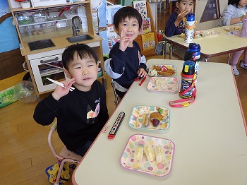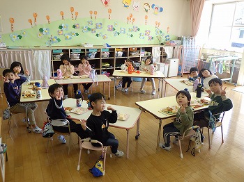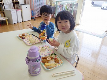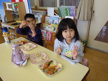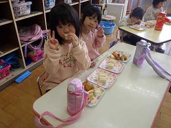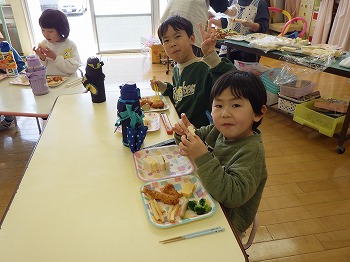 今日は園児みんなでミックスランチをしました。きく組さんのリクエストのおかずにサンドイッチにゼリーと好きな食べ物がいっぱいで次々とほおばりながら会話を交え、楽しい食事ができました。修了式まであと6日。楽しかった思い出の1ページになるといいですね。