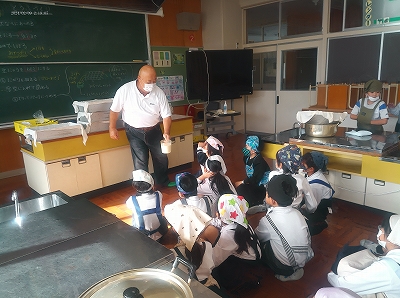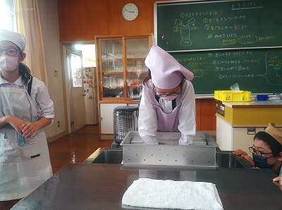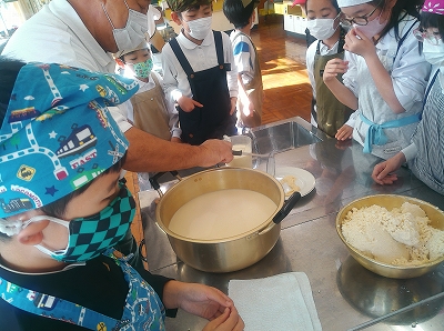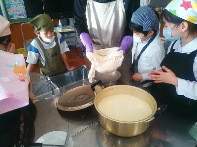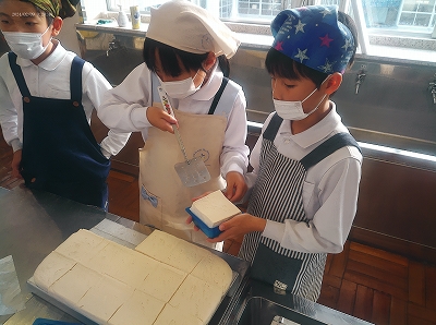 国語で大豆について学習している3年生が、ウスヤ食品さんや栄養教諭の先生にお手伝いいただいて豆腐づくりをしました。普段からよく食べている食材を実際に作ってみることは、食育の観点でも有意義なことです。出来上がった豆腐はお家へ持って帰ります。