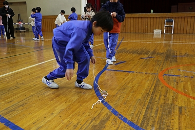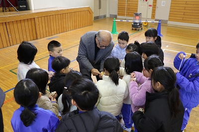 1年生が生活科の学習で、昔の遊びを体験しました。今回は地域の方にひもを使ったコマまわしを教わりました。