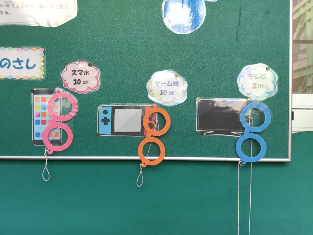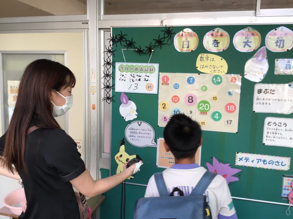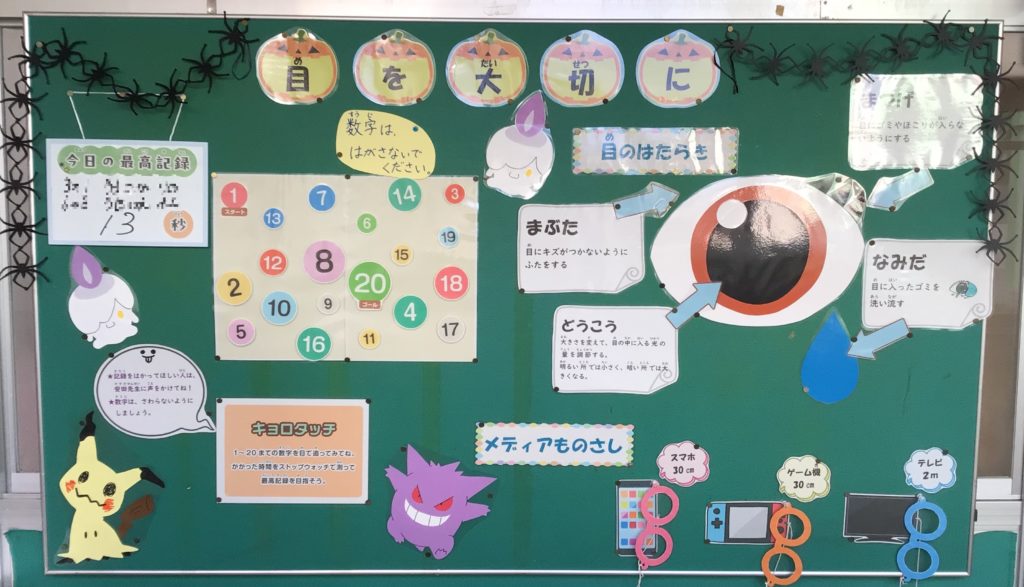 視力検査の結果は? -10月は「目の愛護月間」 7 10月,2025 立待小学校編集者 今週からどの学年でも視力検査が行われます。 検査結果がB以下の人には、ピンク色のお家の人へのお知らせの紙が配られます。もらった人は医療機関を受診するようにしましょう。 10月10日は「目の愛護デー」、「10と10を横にすると人の目と眉の形に見える」からだそうです。分りやすいですね。ということで、保健室の今月の掲示物のテーマは「目を大切に」です。 動態視力の速さにチャレンジ中。①~⑳の数字を順に見つけて、ストップウオッチで何秒かかったかを図ります。最高記録13秒が、今日11秒に更新されました。 これは「メディアものさし」。メガににはひもがついていて、それぞれの端末を利用するときの「適切な距離」を体感できます。保健の先生の工夫はすごいですね。