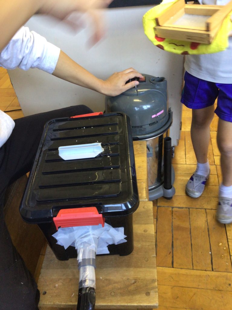 掃除機を接続した手作りの吸引機で水分を取り除きます。黒い箱の中央の白い開口部が吸い込み口です。