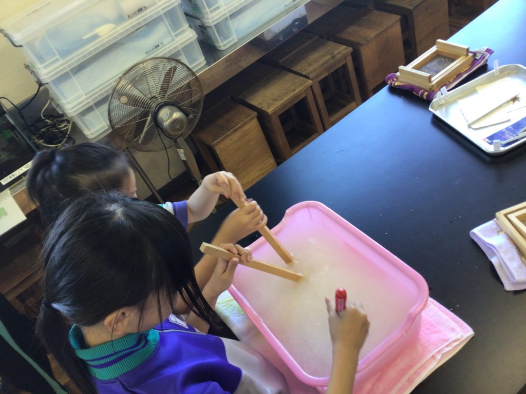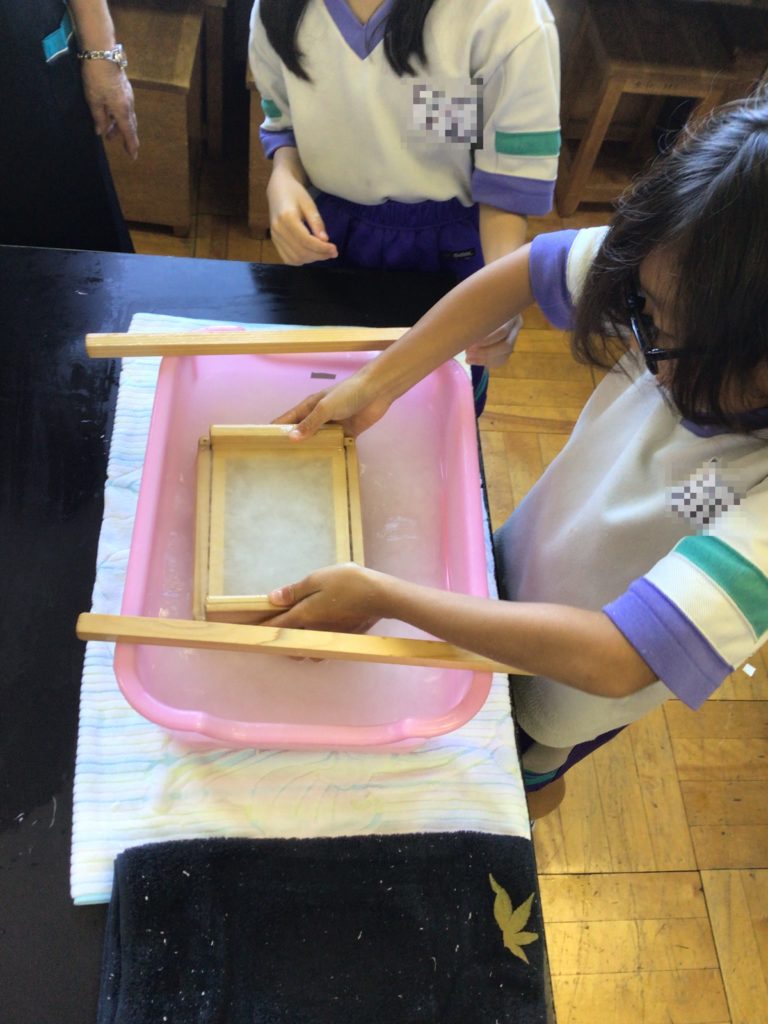 網から漉いた紙を慎重に取り外し、上から乾燥用のタオルをかぶせて完成です。最後に数人の児童から感想を聞きました。「間に葉っぱを挟むのが難しかったです。」「紙の作り方が分りました。」といった感想がありました。