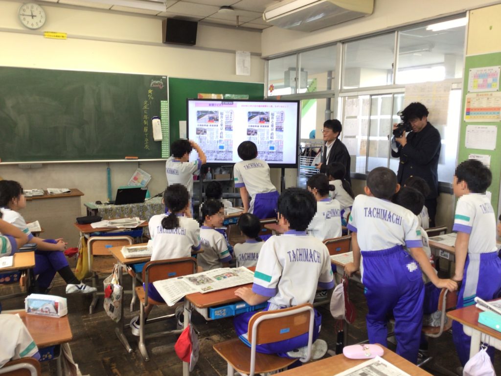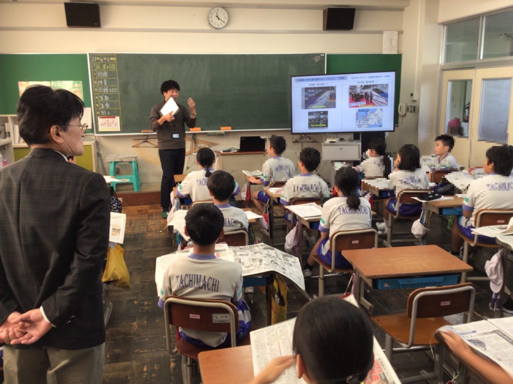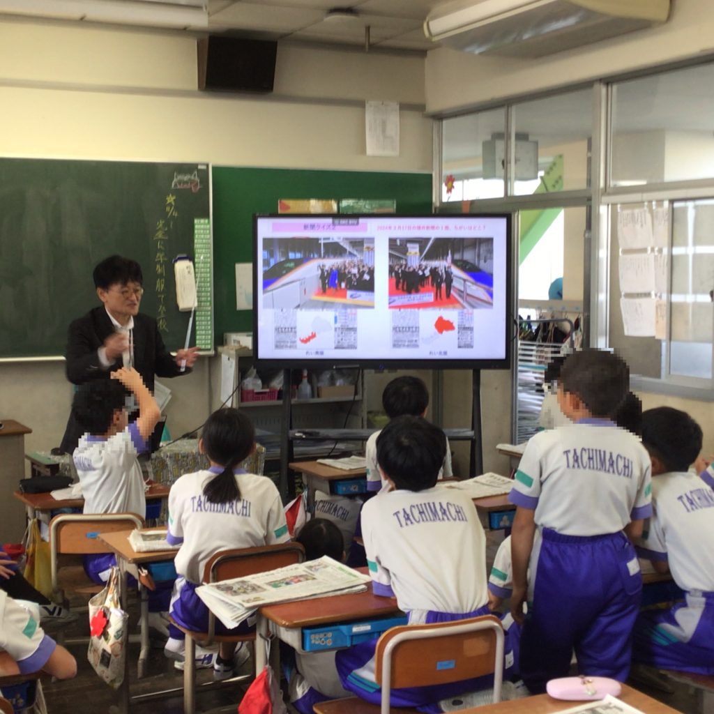 授業の最初はクイズで始まりました。モニタに福井で新幹線開通したことを報道した同じ日の福井新聞の1ページ目が2つ写されました。よく見ると違うところがあるそうです。5年生の皆さんは一生懸命違うところを探しました。