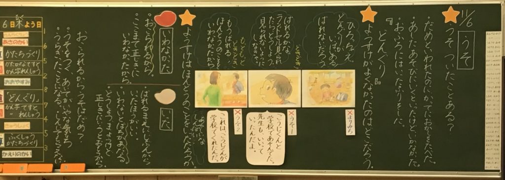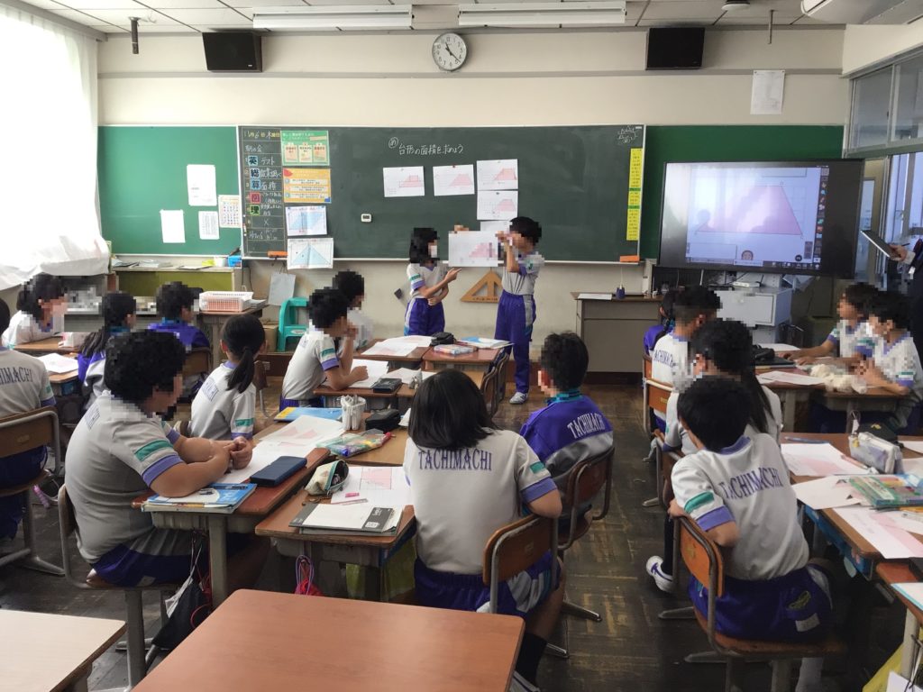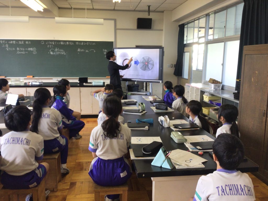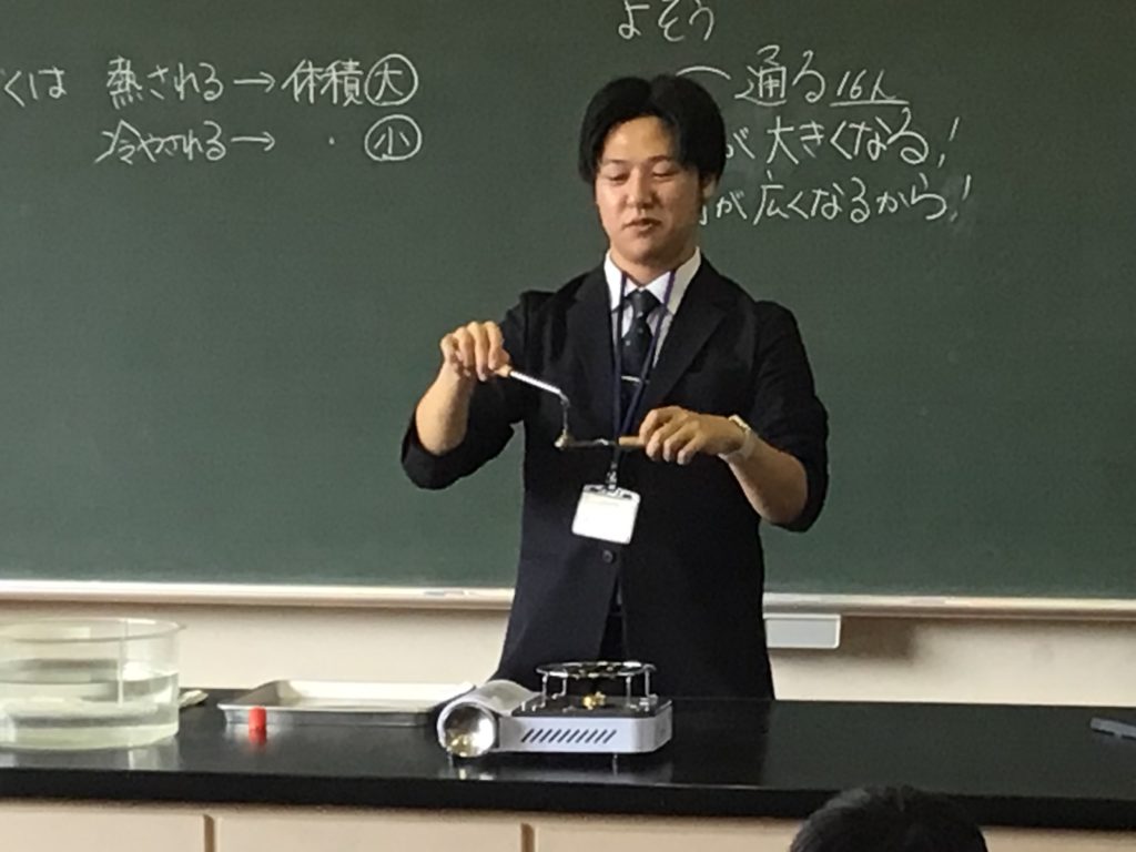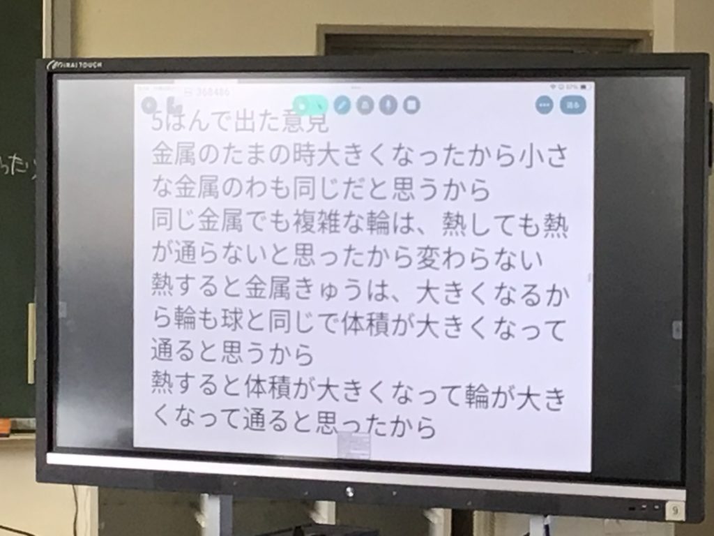 前の時間までに金属を熱すると体積が大きくなることを学んでいます。この実験では金属でできた球と、球がぎりぎり通過する大きさの輪を使います。輪を熱した場合、球は輪を通過するかしないかを予想しその理由を考えました。「通る」は16名、「通らない」は10名でした。