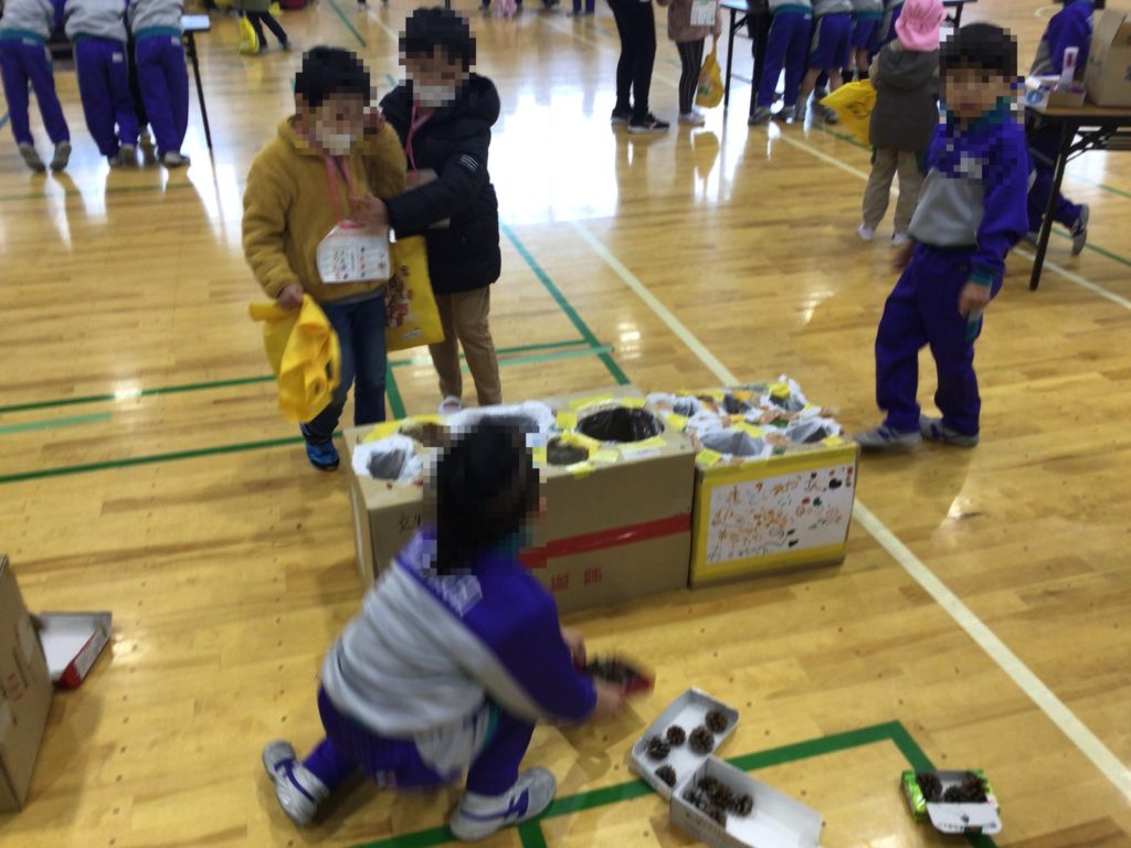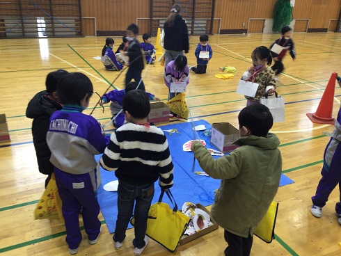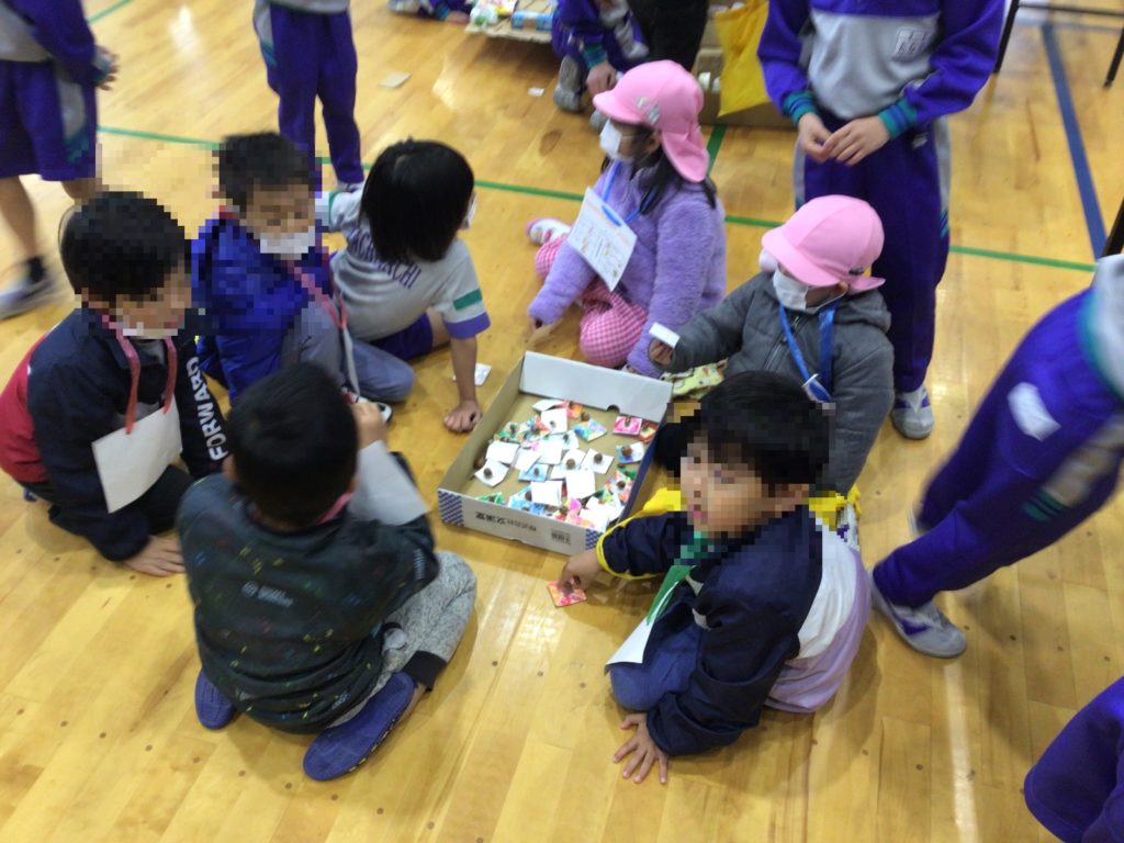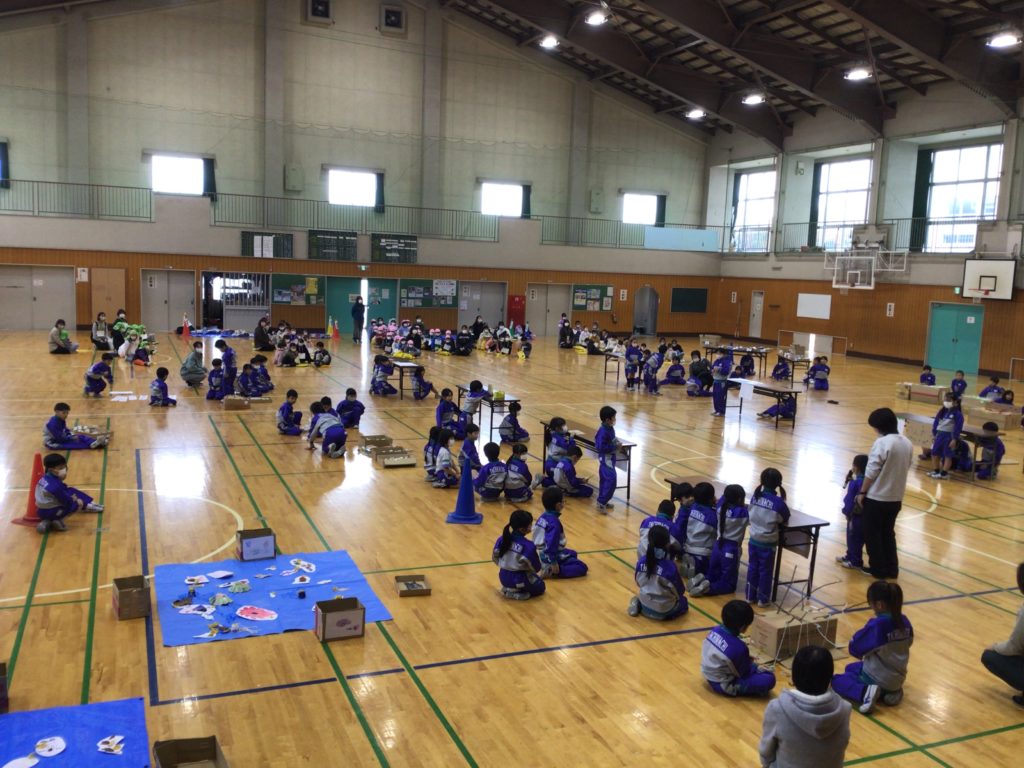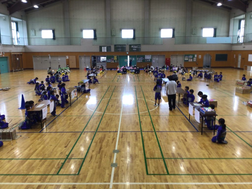 年長さんをご招待「秋のおもちゃランド」(1年生) 19 11月,2025 立待小学校編集者 1年生が、立待保育所、吉江保育園、白蓮保育園の年長さんをお招きして、大々的に「秋のおもちゃランド」を開催しました。体育館の後ろにいるのが年長さん、後ろから前に伸びる真ん中の通りが「おもちゃランド」のメインストリートです。 1年生の皆さんは、メインストリートの左右に4つずつ、計8つのコーナーを設けて、年長さんに楽しんでもらいます。 1つ目 あきのさかなつりやさん 2つ目 こまやさん 3つ目 めいろやさん 4つ目 がっきやさん 5つ目 くじびきやさん 6つ目 まといれやさん 7つ目 けんだまやさん 8つ目 たのしいぼうりんぐ 最後に感想やお礼を伝え合っておもちゃランドは終園。年長さんに楽しんでもらって、1年生の皆さんも大満足。大成功! 。