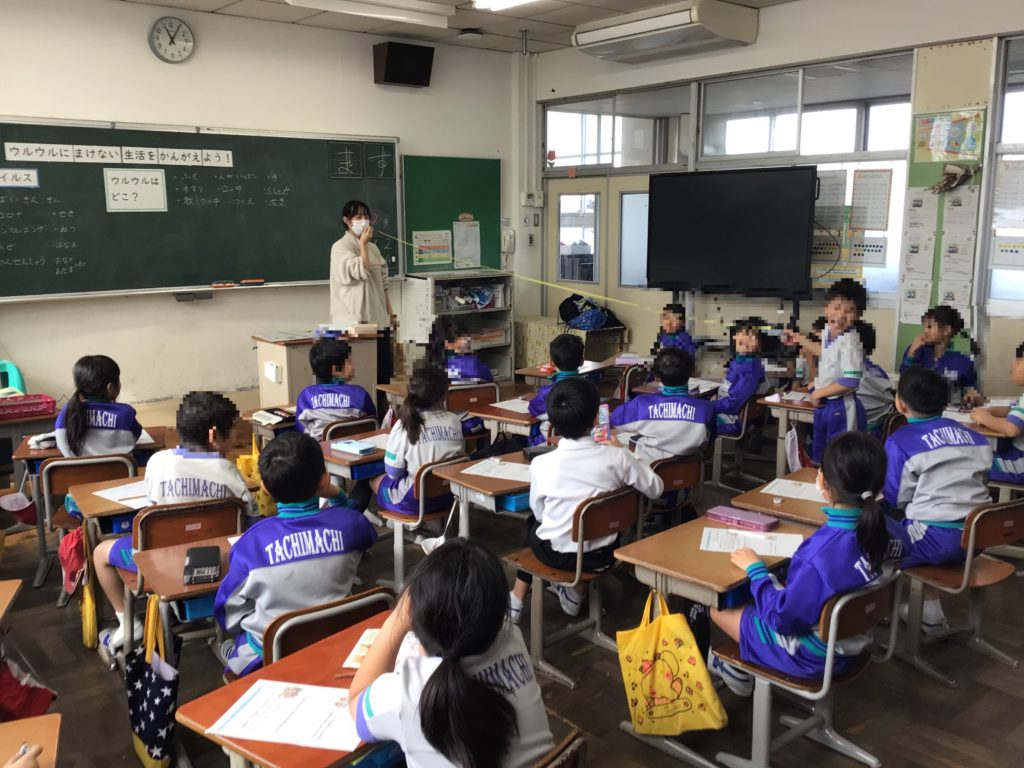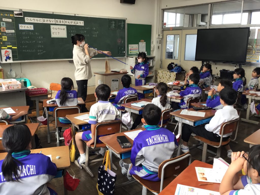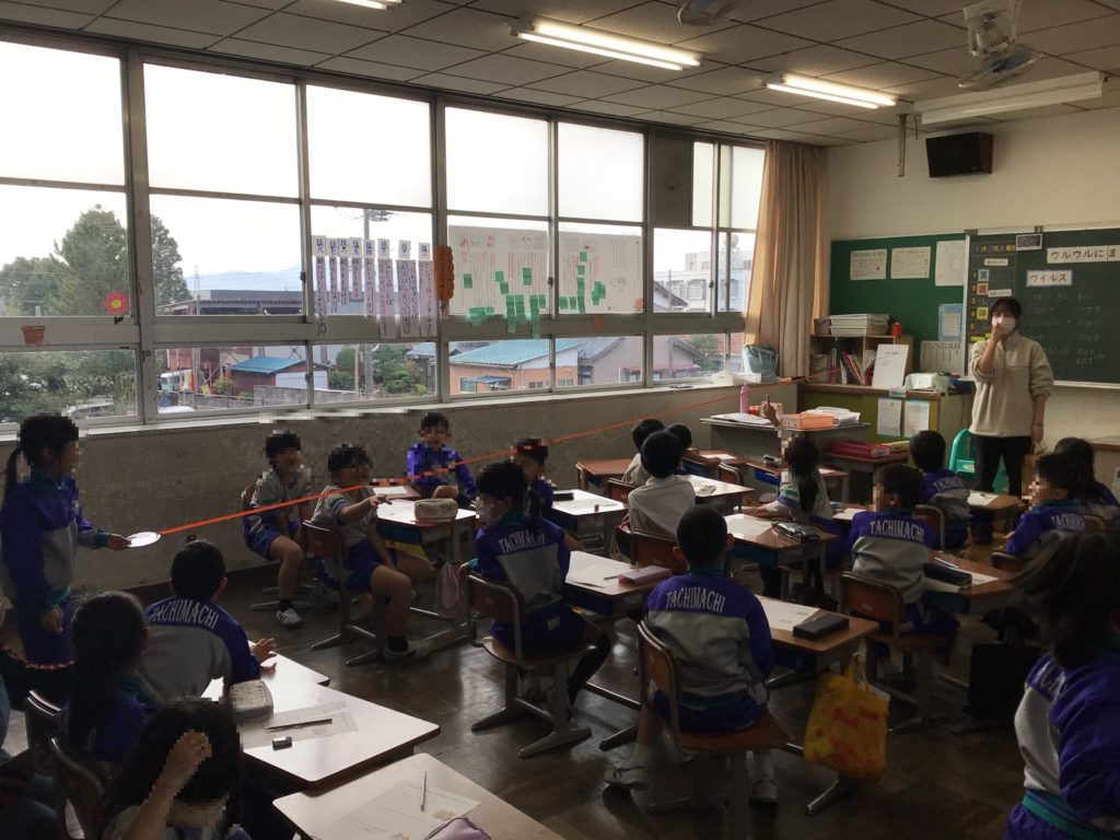 せき、くしゃみでウイルスはどれくらい飛ぶ?(2年生) 28 11月,2025 立待小学校編集者 2年生では体重測定の後の保健の学習で「ウイルスに負けない生活」について考えました。保健の先生の口元から「青いひも」が伸びていて、ひもの先にはウイルスのキャラクターが描かれたカードがついています。「おしゃべり」をするとウイルスは、このひもの長さ分の1m飛ぶ様子を体感しました。 次は「せき」をしたときにウイルスが飛ぶ距離です。先生の口元から出ている「黄色いひも」を引っ張っている児童までの距離は3m。教室の半分ほども飛んでいるので皆さんビックリ! 最後に「くしゃみ」をしたときにウイルスが飛ぶ距離です。先生の口元から出ている「赤いひも」を引っ張っている児童までの距離は5m。教室のほとんど後ろの方まで飛ぶ様子が分かって、皆さんビックリ仰天!保健の先生から「マスクをしたらほとんど飛ばない」と聞き、マスクを着けることの大切さを実感できたようです。