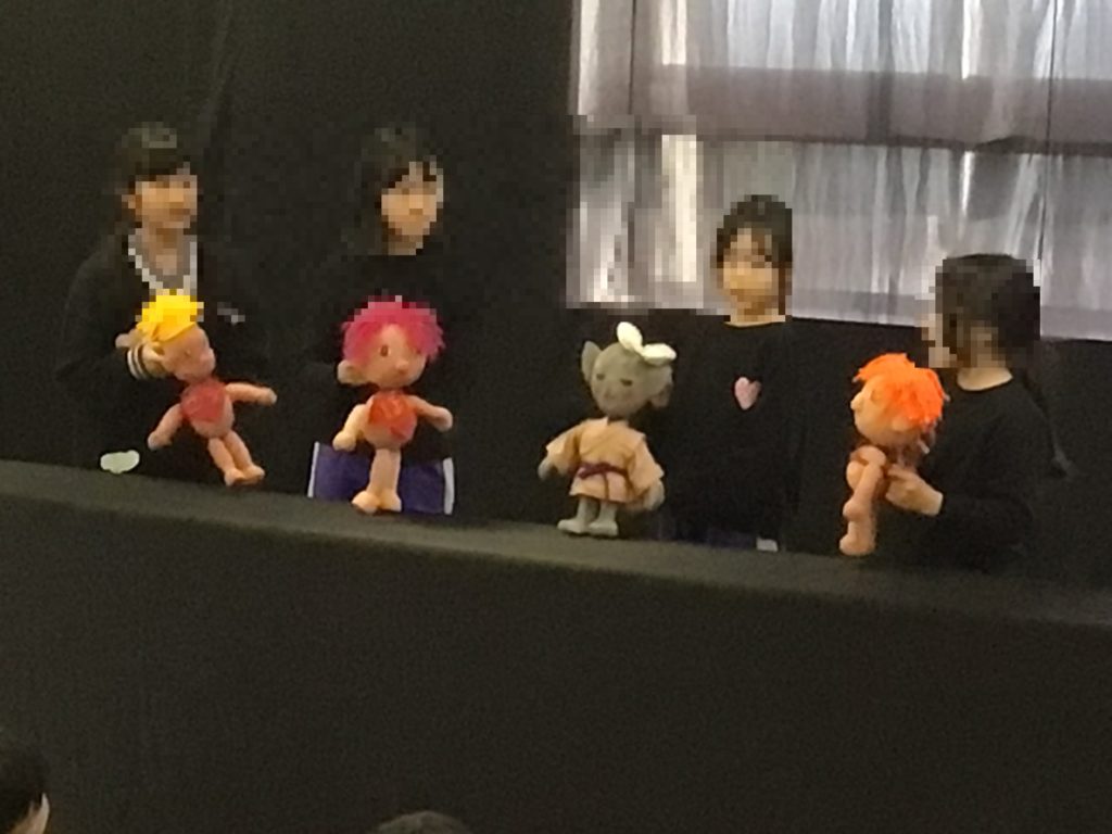 「じゃ」「ぼん」「こう」がドタバタと追いかけるところを、ピコタ(右から2番目)はひらり、ひらりとと交わす様子がおかしく、人形の動きに効果音などの演出効果も加わって、見ている1年生の皆さんは大喜びです。