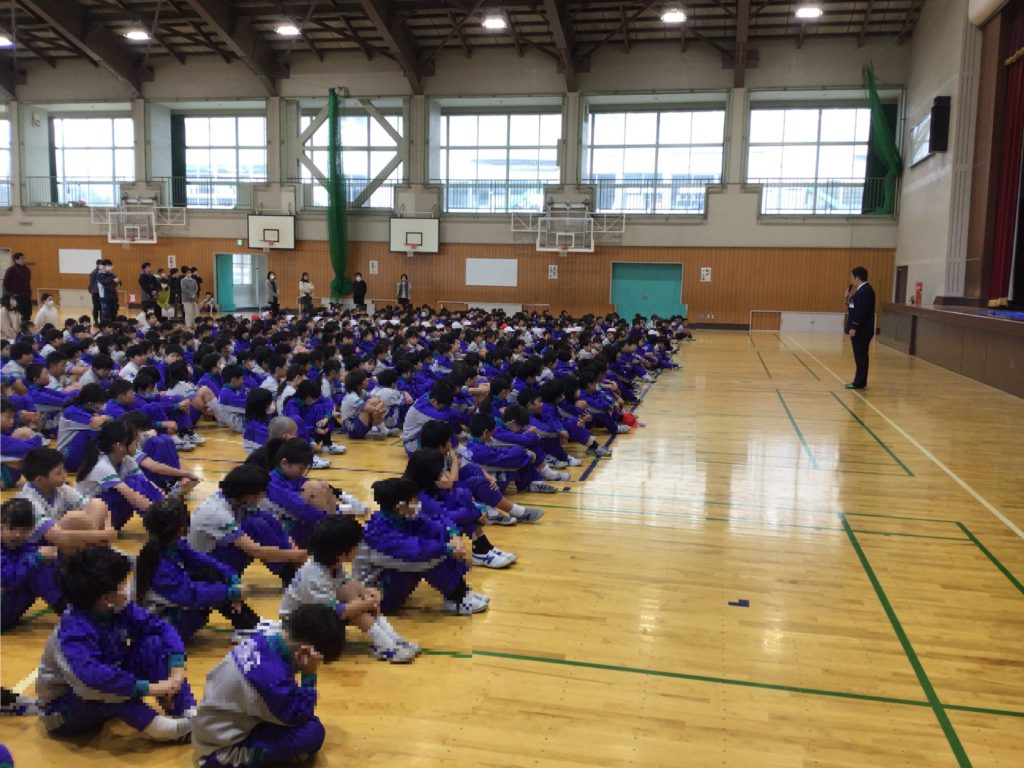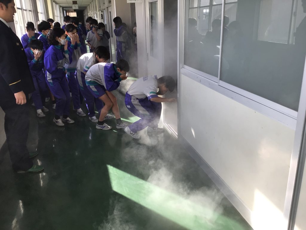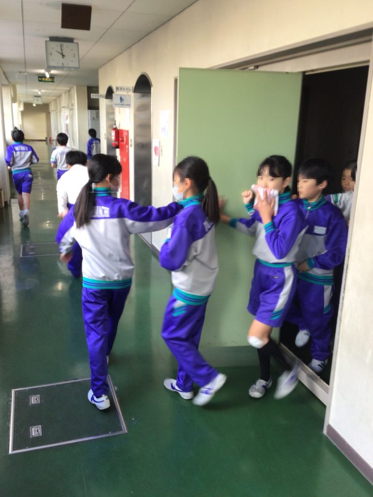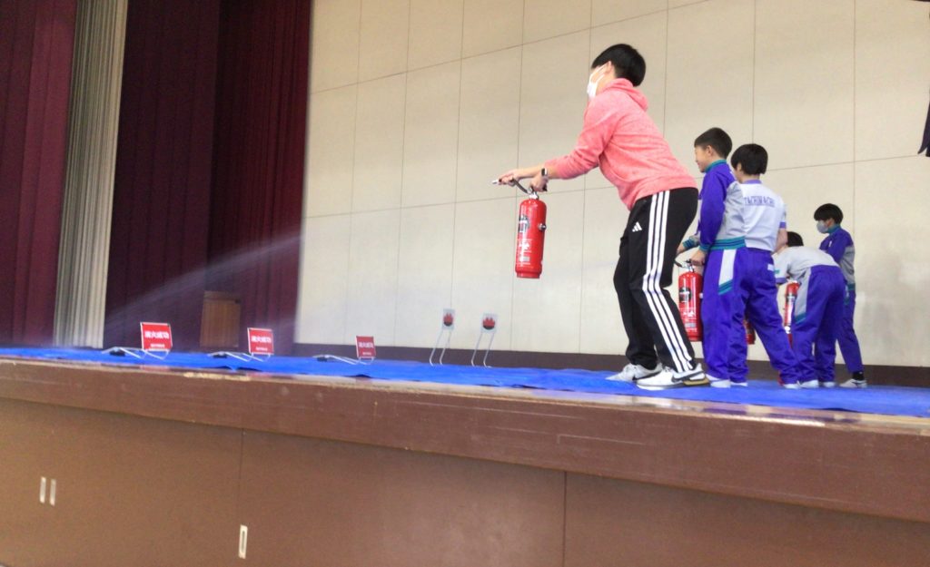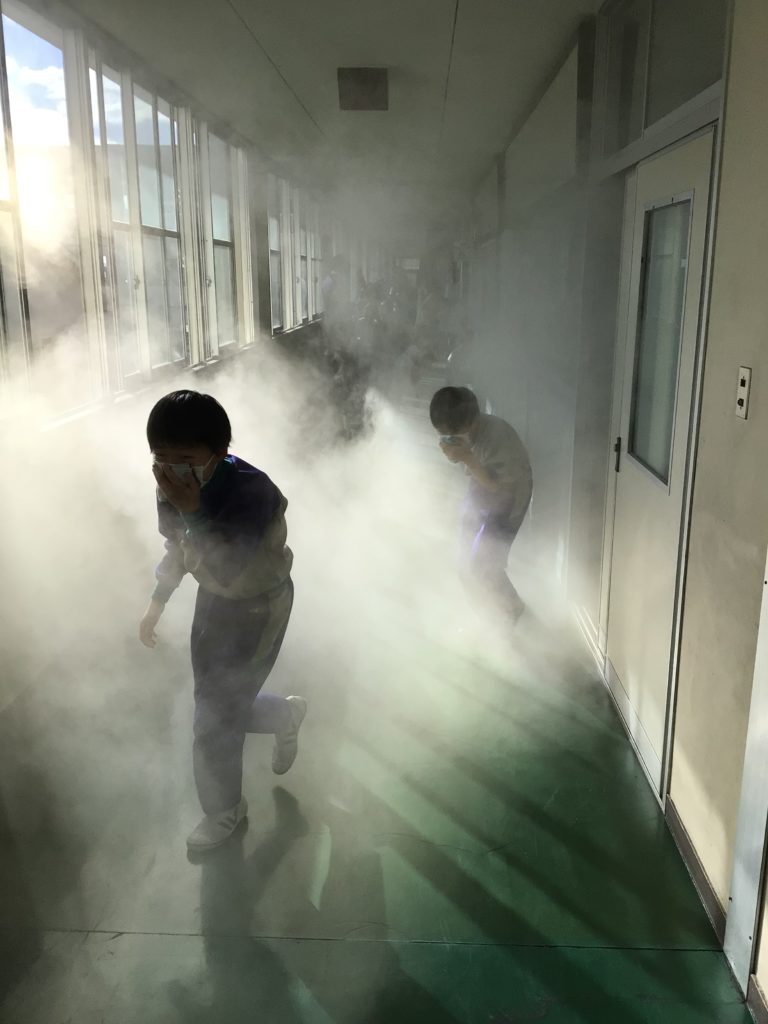 避難訓練 -けむり体験も(全校) 10 12月,2025 立待小学校編集者 避難訓練がありました。休み時間中に地震が発生し、その後、理科室で火事が起きたという想定です。理科室の付近では訓練用の煙が出ていたり、避難する途中では防火扉が閉まっていたりして、緊張感をもちながらの訓練でした。 体育館で「全員無事避難完了」の確認を終え、消防署員の方のお話をお聞きしました。お・か・し・も(おさない、かけない、しやべらない、もどらない)をちゃんと守っていたとほめていただきました。 児童と先生の代表による消火器の使い方の訓練もありました。消防署員の方から「ピン・ポン・パン」と覚えましょうと習いました。黄色いピンを外し、ホースをポンと外し、レバーをパンと押すそうです。 最後に煙が充満した部屋で避難する体験をしました。この写真は煙の部屋を脱出してきたシーンです。部屋の中は煙で真っ白でほとんど見えません。消防署の方より、そういうときは、壁を手で触りながらすすむとよいと習いました。(煙は訓練用で吸っても健康に影響はないようです。(ちょっと甘い香りがしました。))