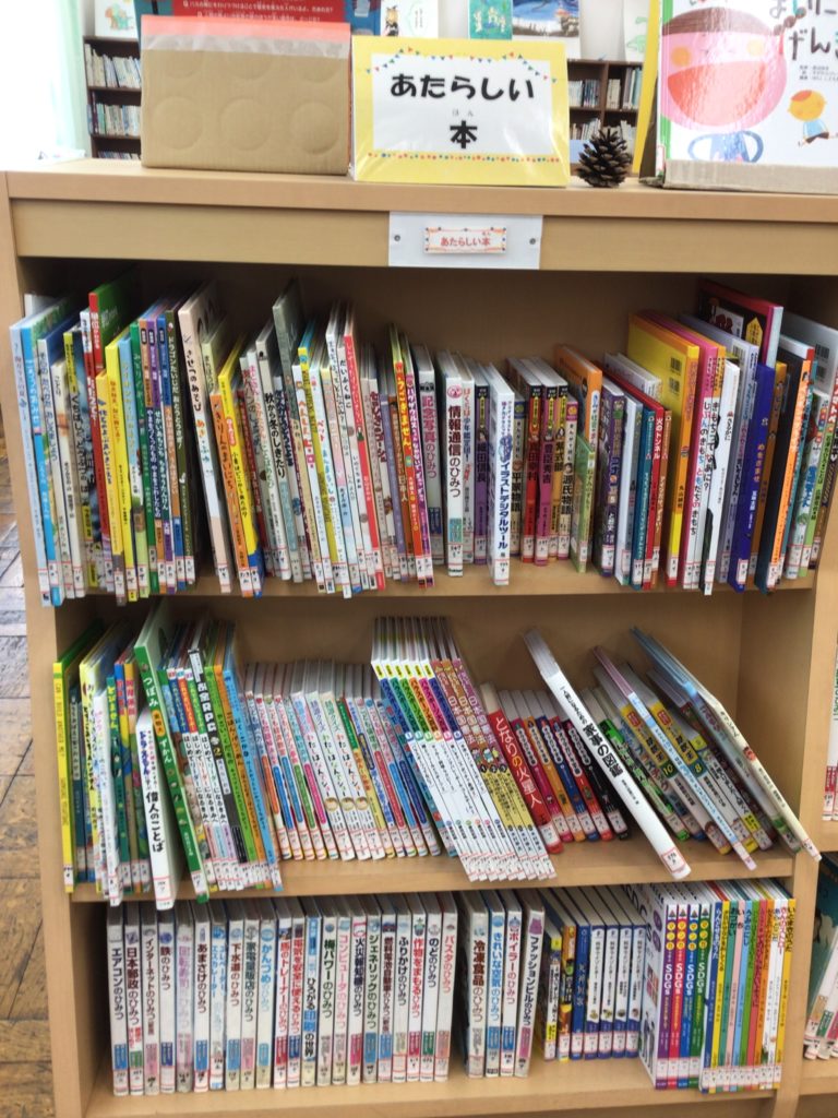 図書館司書さんと、ボランティアさんたちは、新しく入った本を登録して貸し出しができるようにもしてくれています。これは新しい本のコーナー。背表紙を見るだけでも見てみたい本がたくさんあります。次から次と手に取ってページをめくってみるだけでもとても楽しい時が過ごせます。