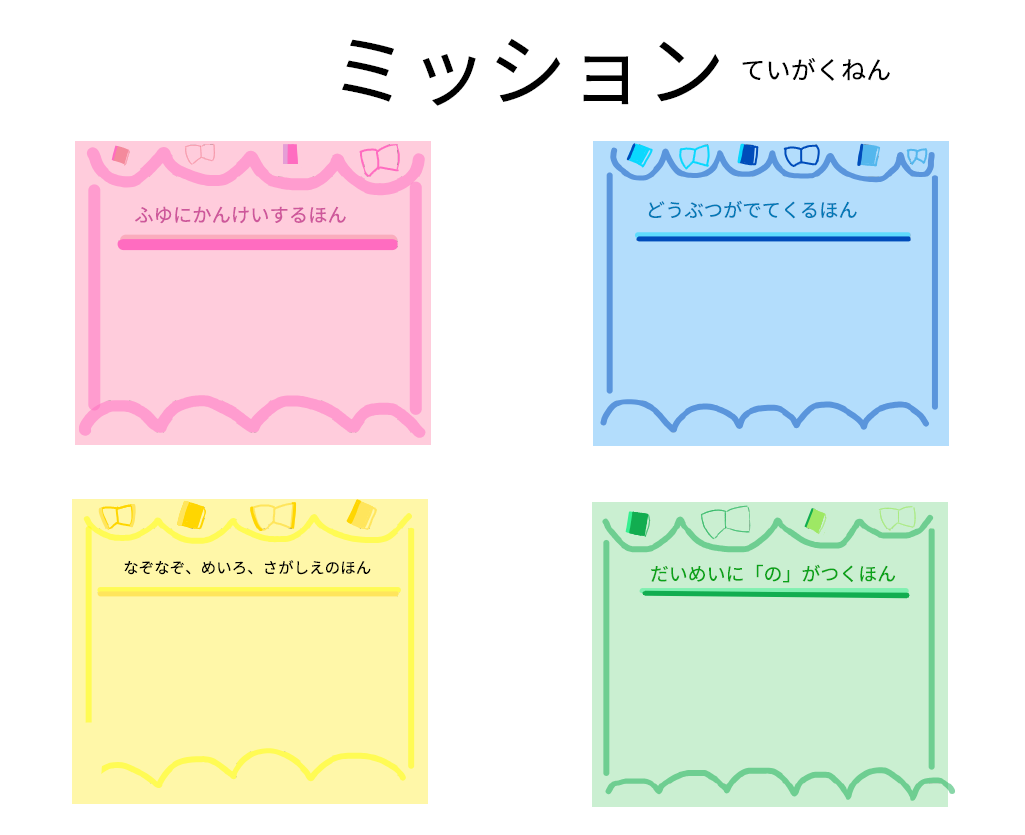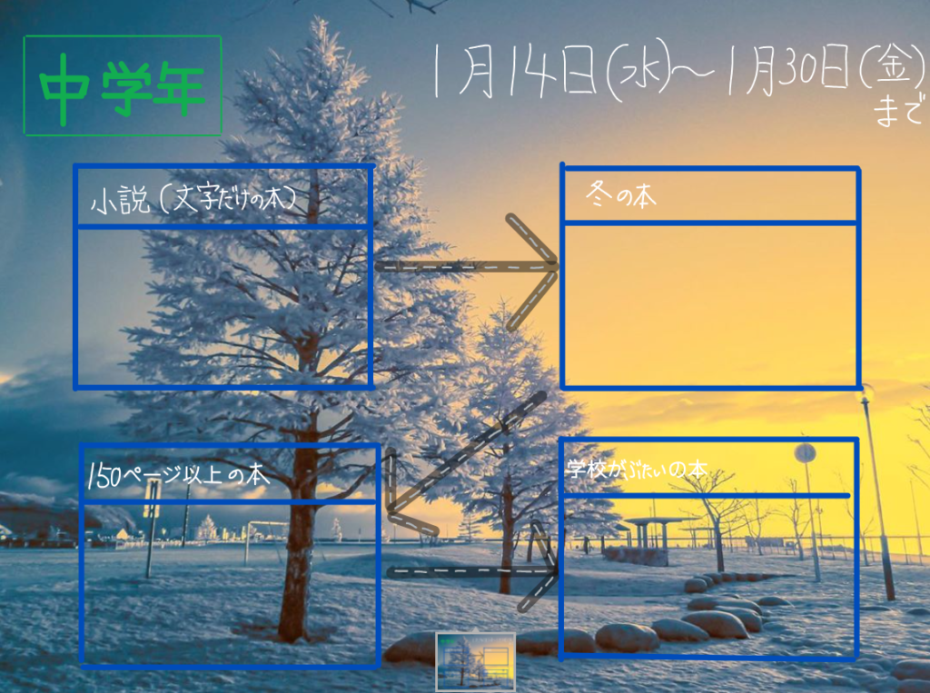 高学年のミッションは、①歴史の本、②小説、③冬に関係する本、④外国のお話の順に本を読むというもので、4種類全部読めればミッション・コンプリートとなります。