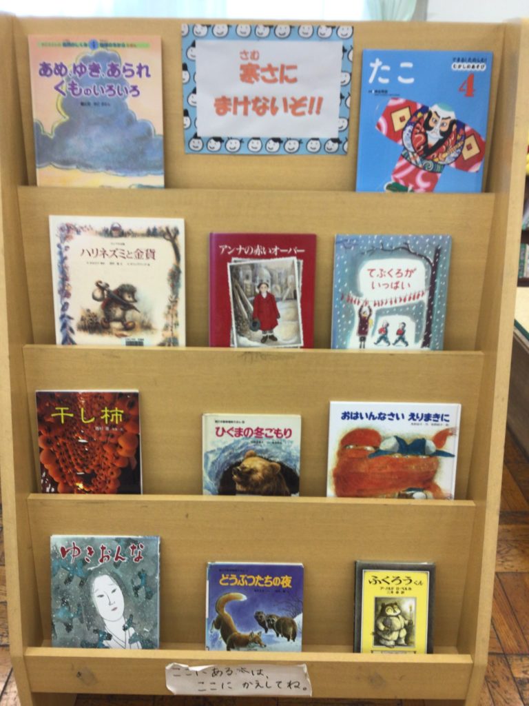 学校の図書室には、毎月2回、鯖江市文化の館から図書館司書さんが来てくださり、図書室の整備をしてくださっています。昨日1/14に展示していただいた特集コーナーのタイトルは「寒さに負けないぞ!!」です。「読書ミッション」にぴったりです。