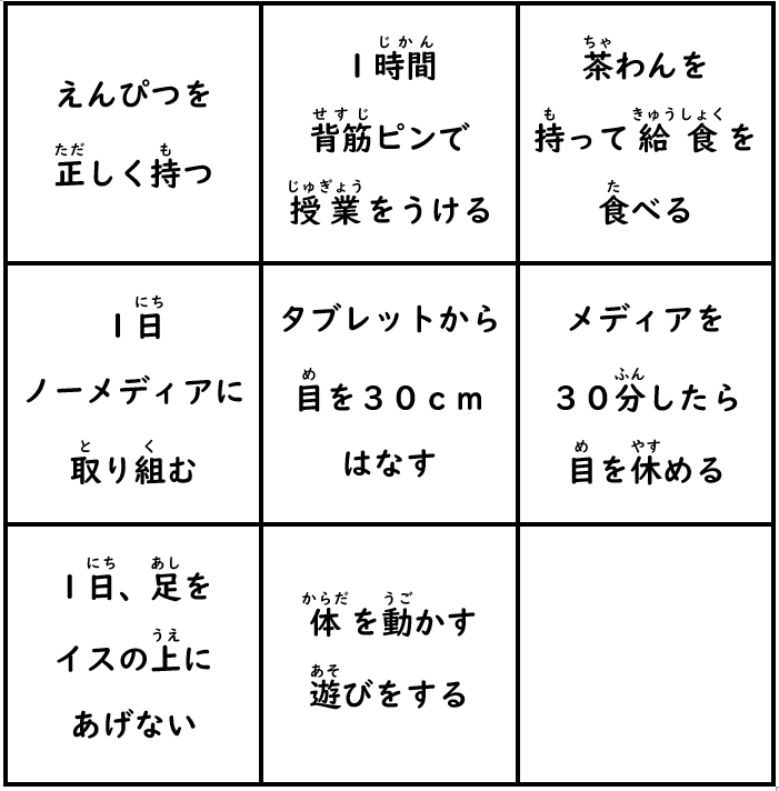 「姿勢ビンゴ」(保健委員会) 4 2月,2026 立待小学校編集者 保健委員会の企画で、2/4から1週間、全校の皆さんを対象に「姿勢ビンゴ」を行います。意識して正しい姿勢を保つための7つの項目(次ページ)をこのビンゴカードに書き写します。真ん中のマスはフリーです。期間中、学校や家で、ビンゴに書いた項目を意識して1週間生活します。できたマスには色を塗ります。3つビンゴになるのが目標です。