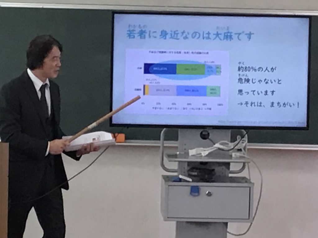 違法薬物には覚せい剤、コカイン、MDMAなどさまざまあります。このシーンは特に若者には「大麻」が身近なものになっていて、約80%の人が「危険じゃない」とまちがった知識をもっていること説明をしている場面です。