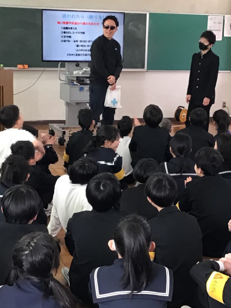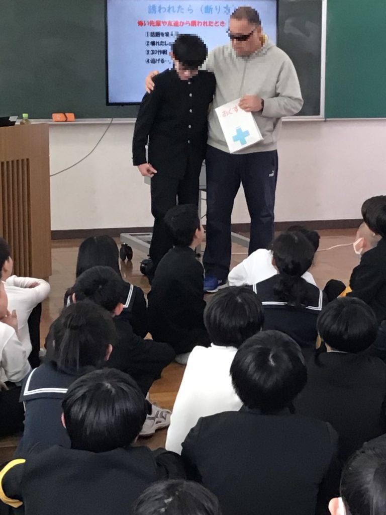 このシーンは、誘われたらどうやって断るといいか、代表児童と怖い先輩役の担任の先生がシミュレーションしている場面です。