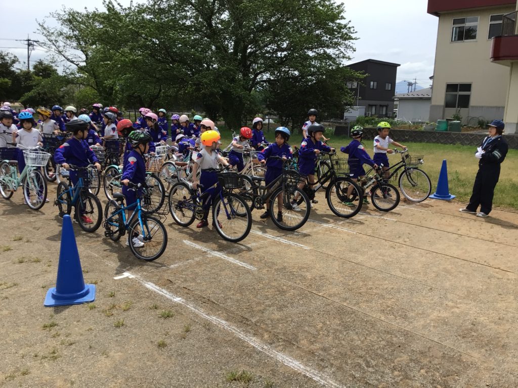 自転車のルールを今一度確認し、実際にグラウンドで「停止」の練習をしました。ブレーキのかけ方を知らなかった子もいたようで、警察署の方のお話をしっかりと聞き、真剣に練習に取り組んでいました。
