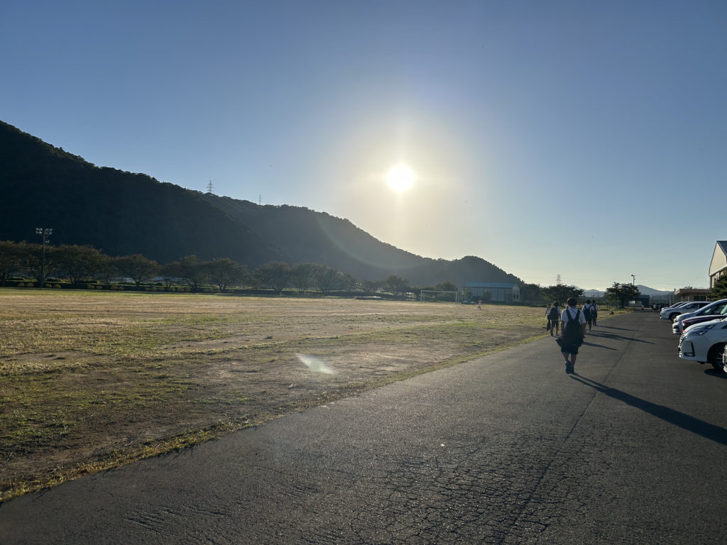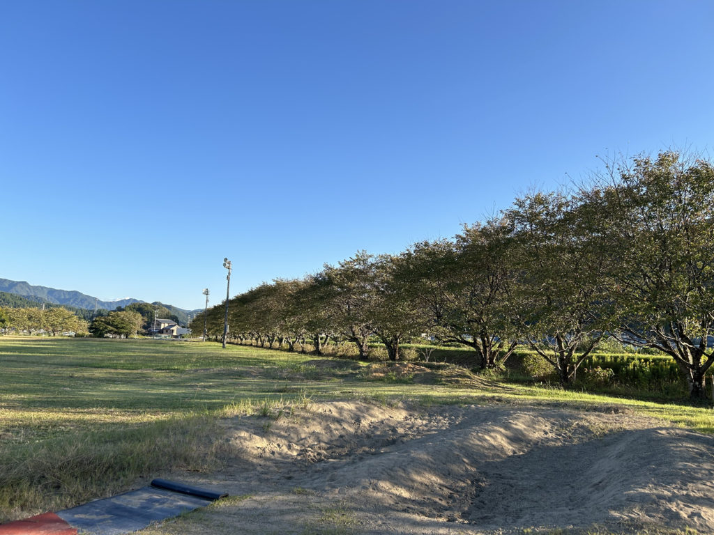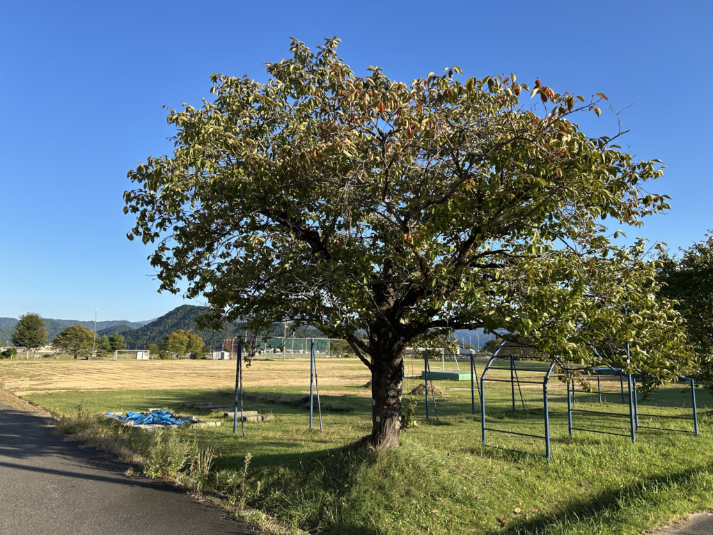 下校時刻ごろの堤防の桜並木です。校庭に長い影が伸びています。