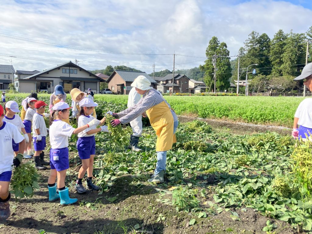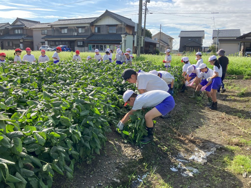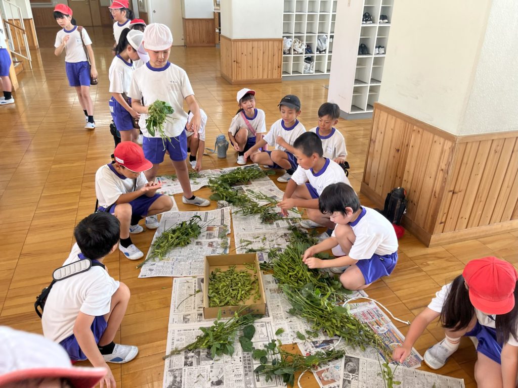 3年生は、サルビア会の方に手伝っていただいて、枝豆を収穫しました。畑から枝豆の茎を抜き、葉っぱを落としてまとめました。学校に持ち帰った後、茎取りをしました。給食の一品として提供される予定です。お楽しみに。