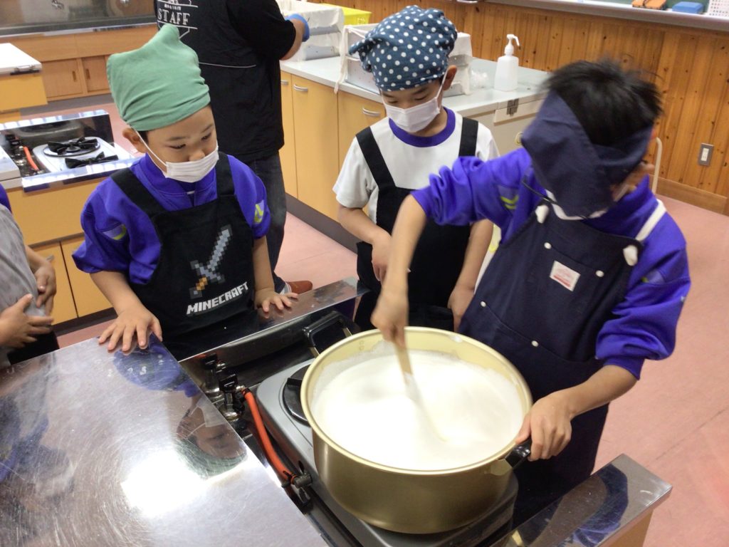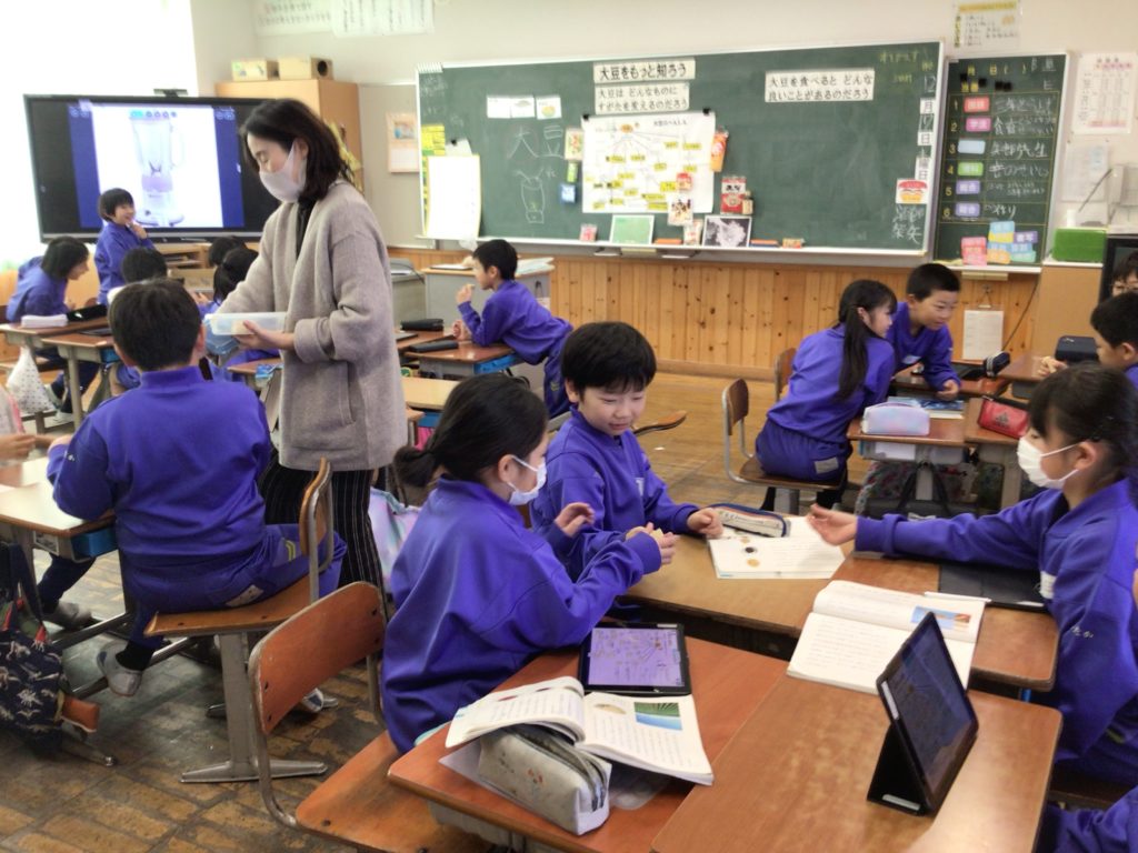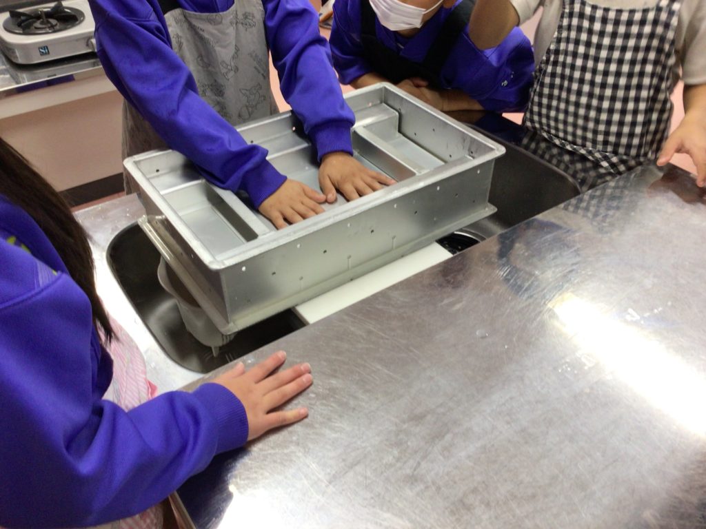 3年1組は、臼谷豆腐店の方に来ていただき、豆腐作りを体験しました。事前に大豆について学習し、実際に高野豆腐を触るなどしました。午後は、大豆をつぶすことから始めて、四角の白い豆腐に仕上げました。(2組は11月に体験しました。)