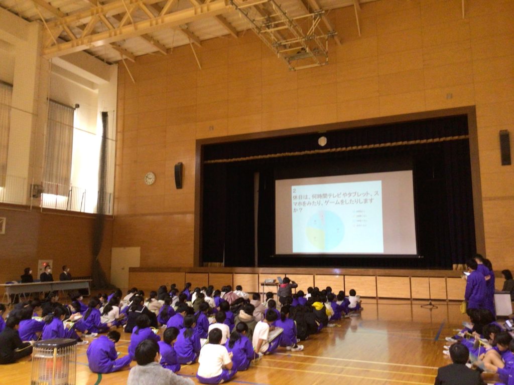 学校薬剤師の先生やPTA会長、副会長に参加いただいて、学校保健委員会を開催しました。今年のテーマは「目」です。保健給食委員会の子どもたちが事前に準備した、目についてのアンケート結果を共有したり、目に関するクイズに答えたりしました。また、体育委員会からは、体力測定の結果が示され、体力面での豊っ子の強み弱みを知ることができました。さらに、目によい体操をみんなで実践しました。