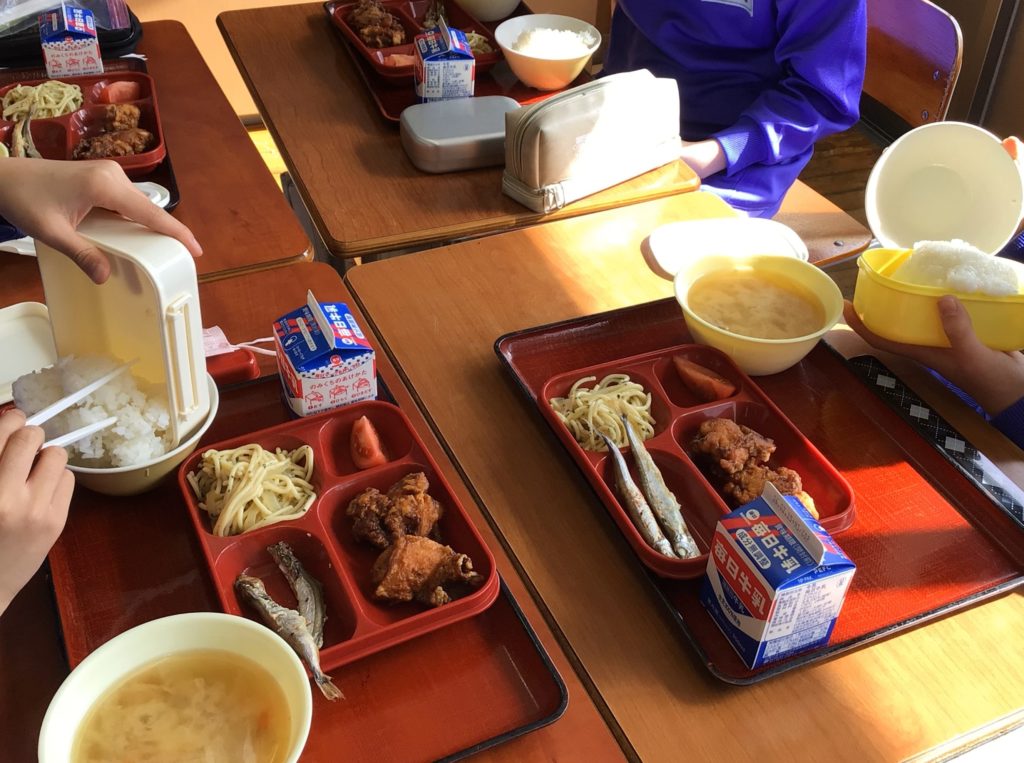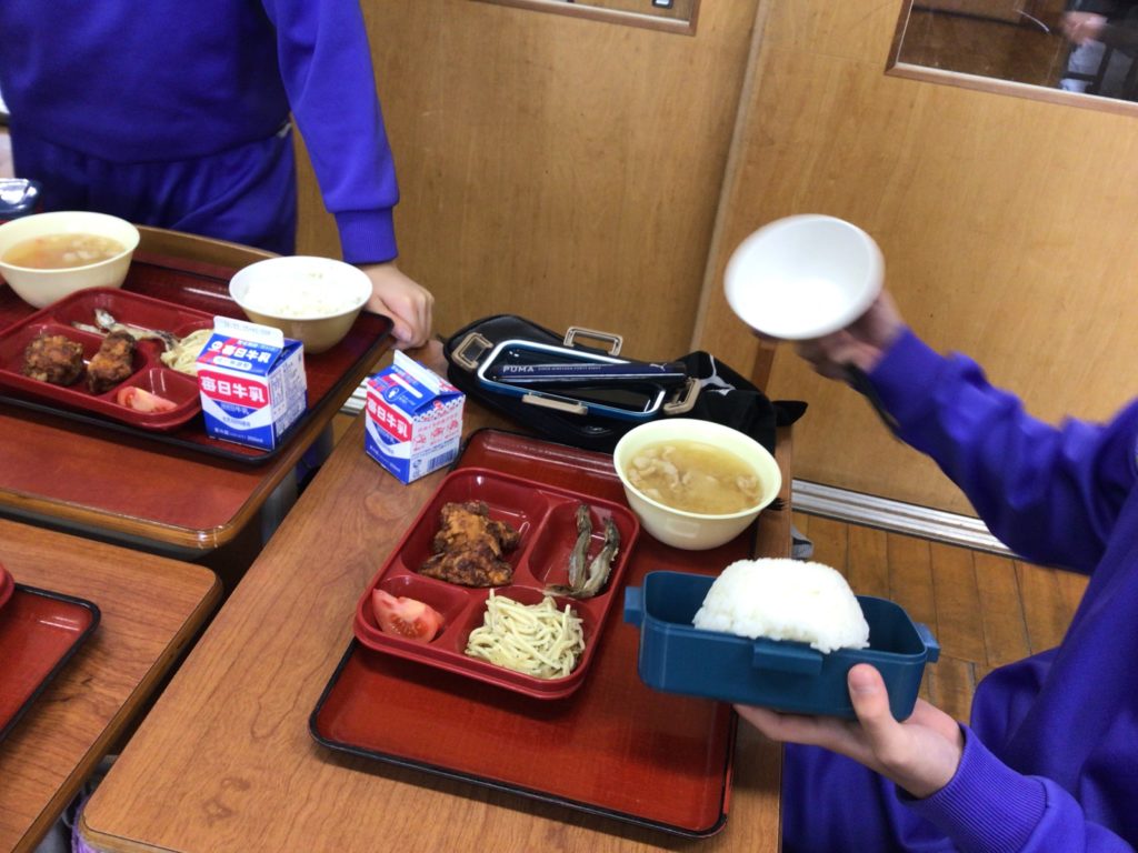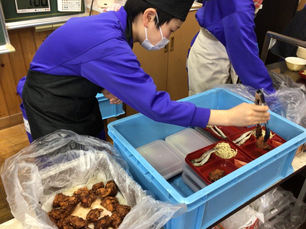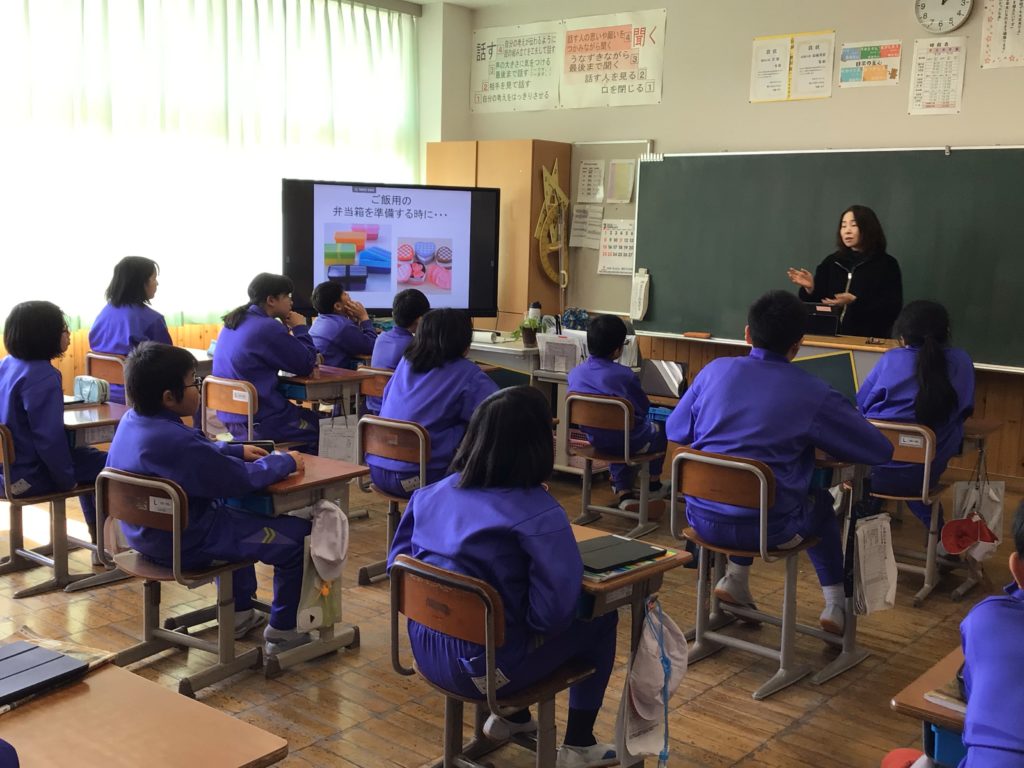 6年生は、中学校での給食を体験しました。鯖江市内の中学校では、ご飯を家から持っていくことになります。給食前に、宮沢栄養教諭から、「中学生の体に必要な栄養を考えて作られているから残さないで食べる」「小学校ではなかった楽しいメニューもある」「おかずの量は均一なので、ご飯で調整するとよい」などの話を聞きました。配膳後は、弁当箱にいつも食べている給食のご飯を入れて、持っていくご飯の量を確認しました。