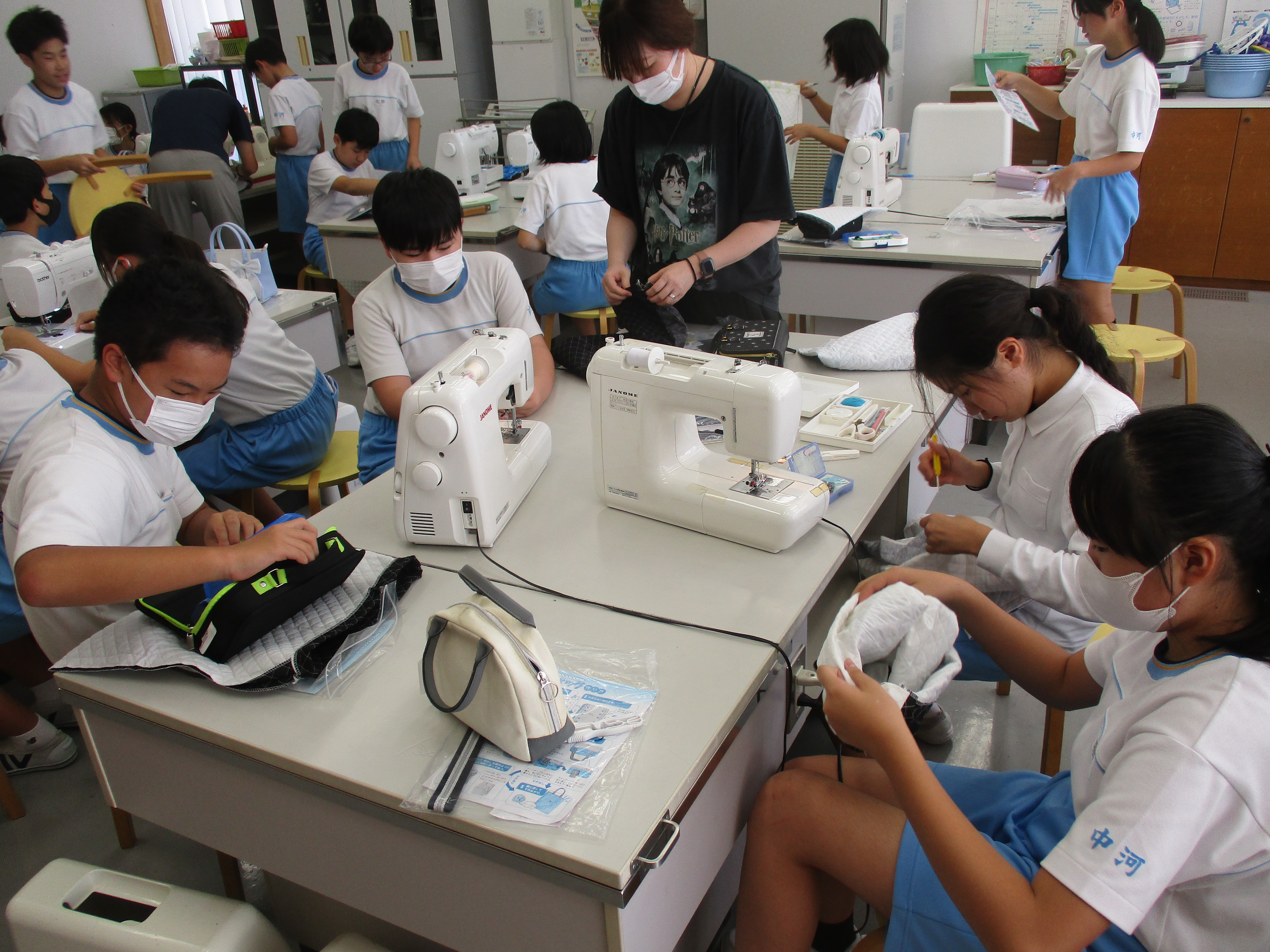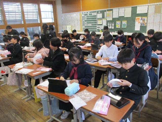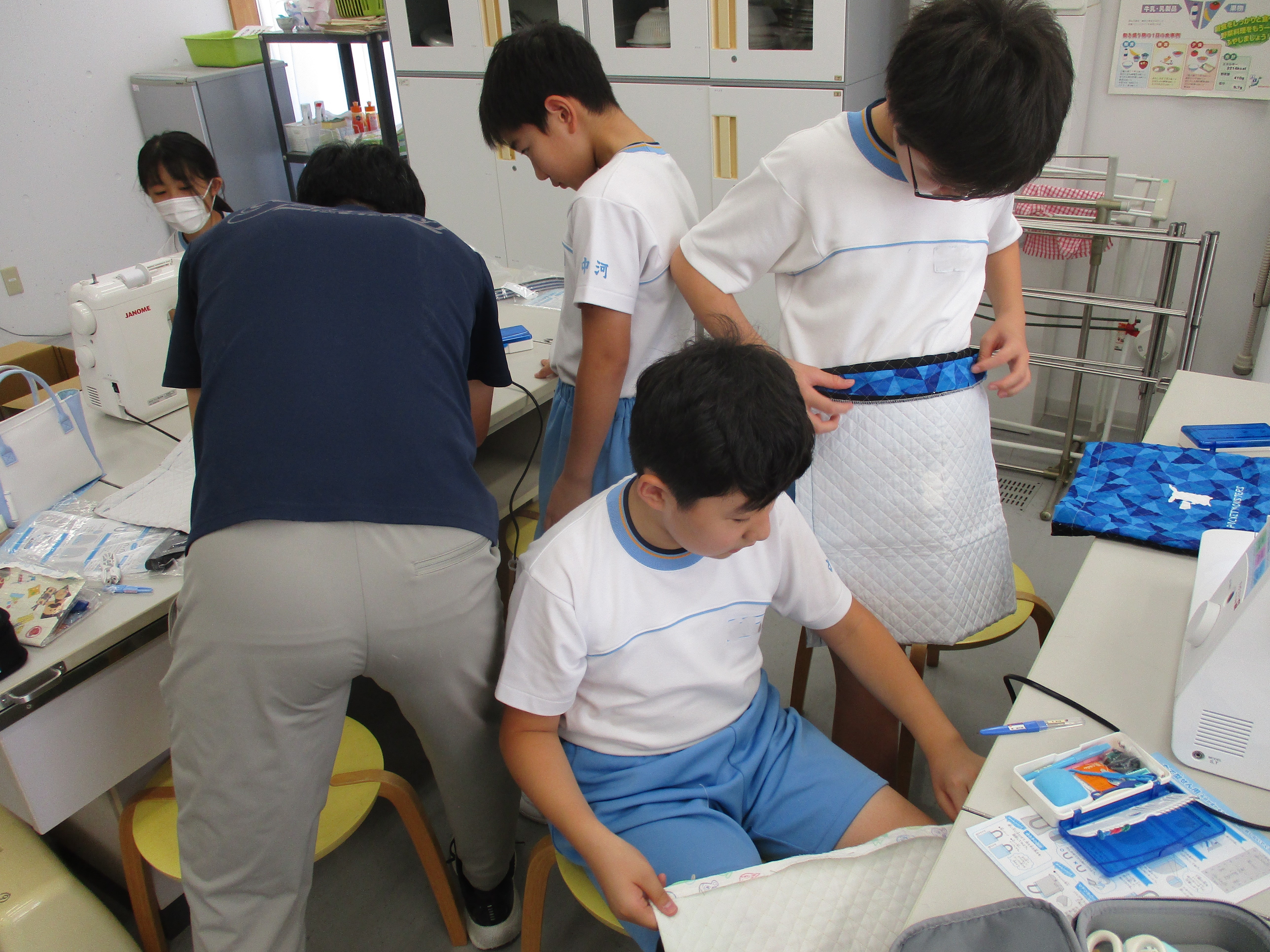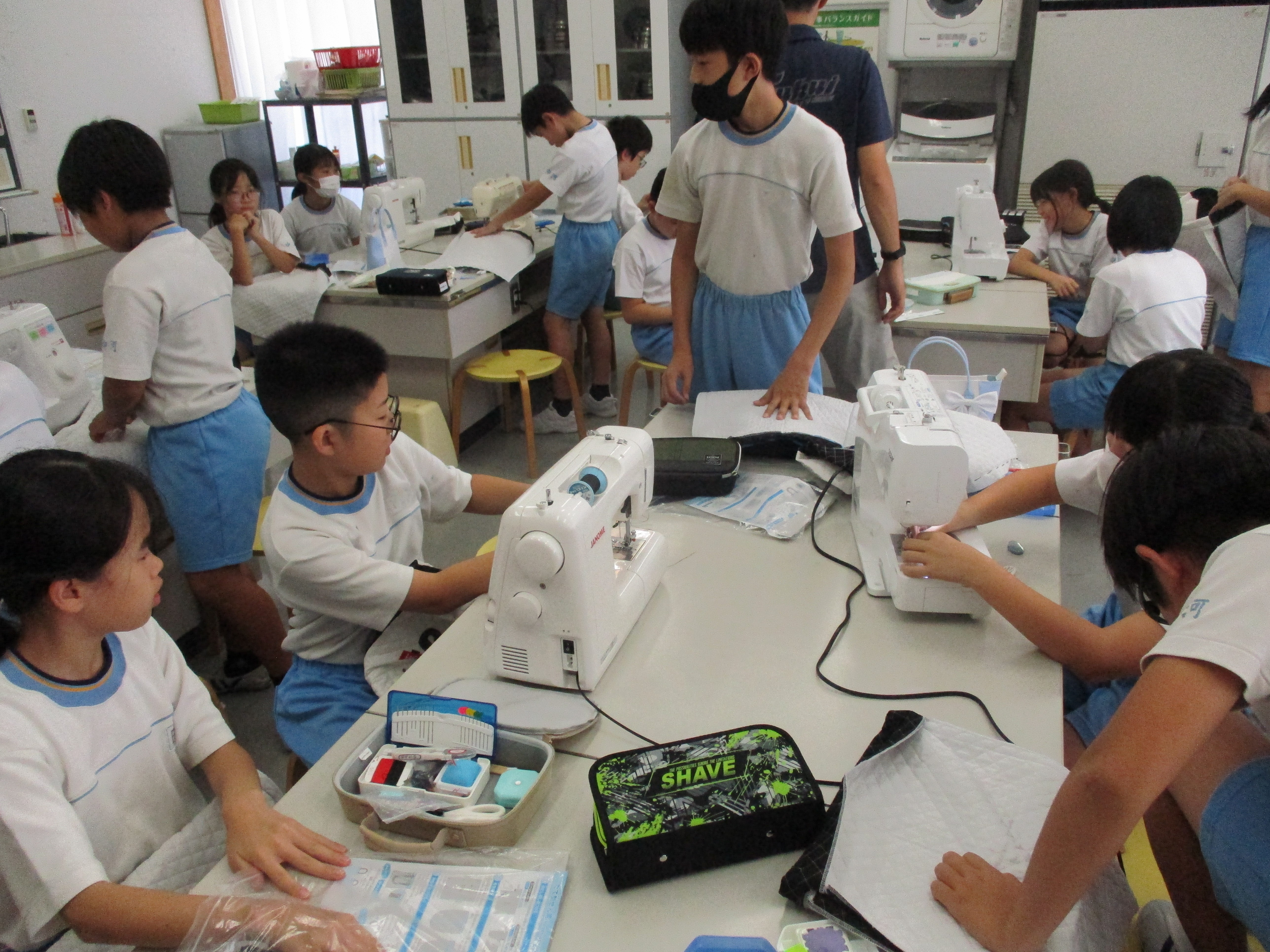 修学旅行を終えた6年生が、家庭科の時間にトートバッグ作りに取り組んでいました。 アニメのキャラクターやスポーツメーカーのロゴなど、自分の好きな布を選んで作っています。ずいぶん以前から取り組んでいたので、本体の部分はほとんどの子が上手に仕上がっていました。これからは、手持ちの部分などを縫い付ける作業に入るそうです。