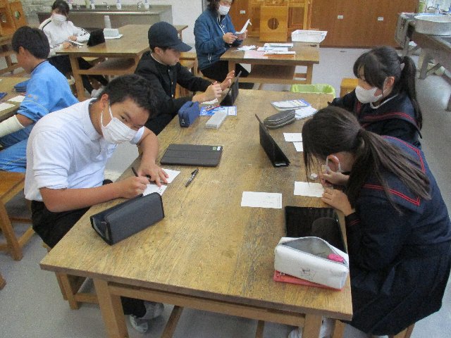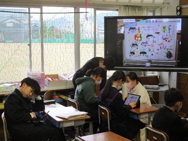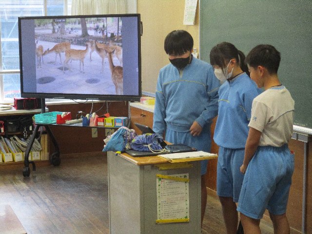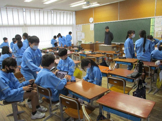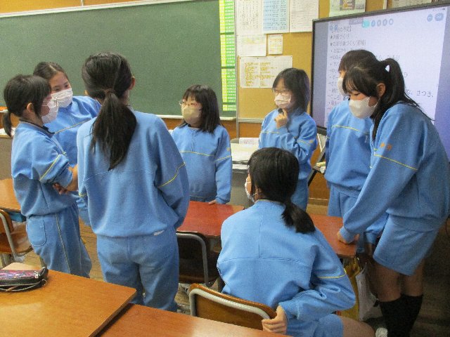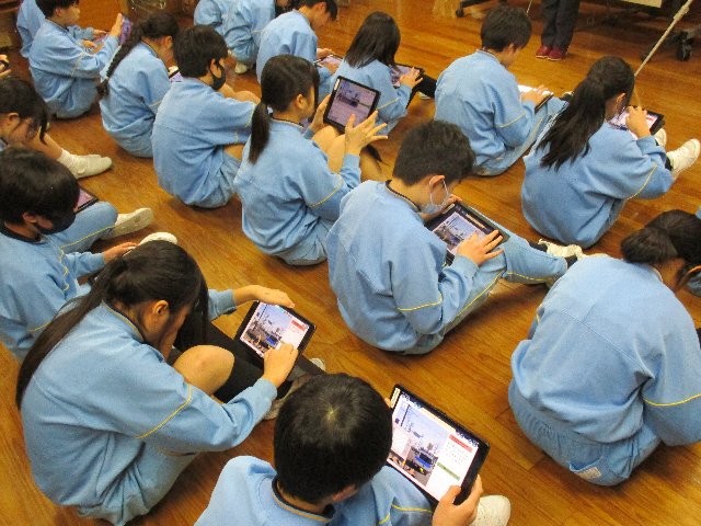 国語の授業で、グループごとに発表の準備をしていました。 単元は『デジタル機器と私たち』というもので、依存症や歩きスマホ、ネット転売など調べたい問題が同じメンバーでグループをつくって活動していました。デジタル機器の良い面、残念な面をしっかり調べて、聞き手が納得できる発表にしましょう。