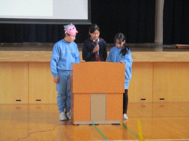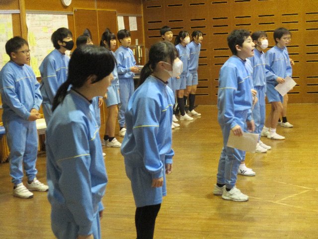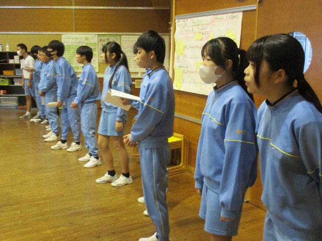 業間の時間におそうじ会議があり、6年生が司会をつとめていました。 このおそうじ会議では、①音楽が終わるまでにならんでいる。②口を閉じて静かにそうじをしている。③時間いっぱい、すみずみまできれいにしようとがんばっている。という3つの項目ができていたかを確認します。全てできた人にはおそうじがんばり賞が当たるので、6年生は責任をもって確認をしていました。