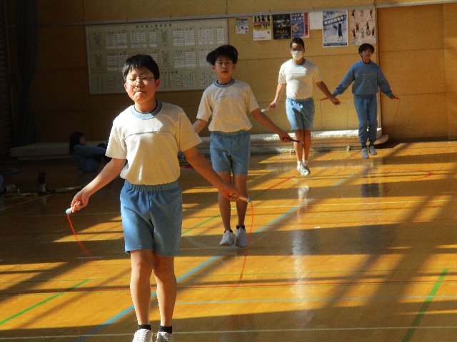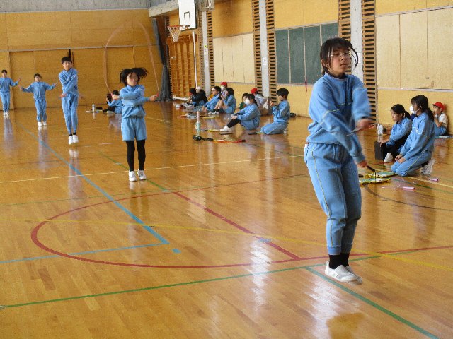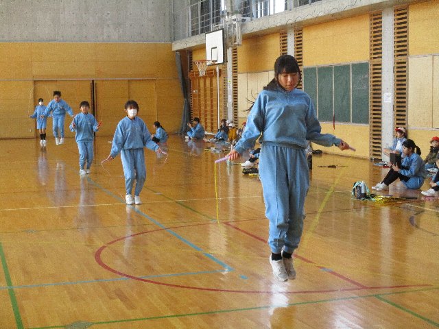 今日は、なわとび大会がありました。上の写真は6年生の様子です。 6年生は、前とび2分間、あやとび1分間、二重とび1分間を行いました。5年生と6年生は行う種目が同じなので、昨年の自分の記録を上回ろうと頑張ってとんでいました。6年生の皆さん、小学校最後のなわとび大会は満足できる結果になりましたか。