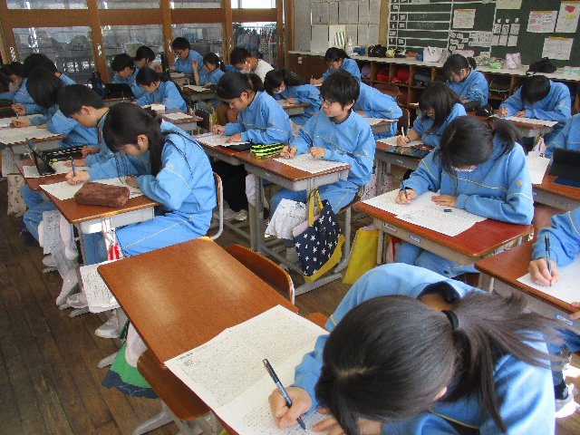 卒業式を間近に控えた6年生が、卒業文集の清書作業に取り組んでいました。 3月12日の卒業式まで、あと1ケ月を切りました。小学校の思い出や友達のこと、家族のこと、それぞれが思いをこめた文集の下書きが終わり、今日はいよいよ清書です。与えられた清書の用紙に、ボールペンを使って一文字一文字間違えないように慎重に書き進めていました。