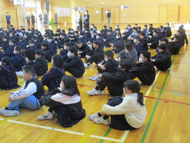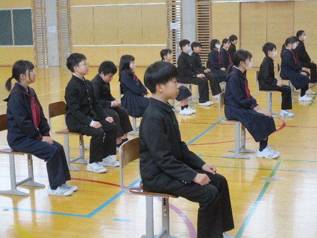 今日は2学期の終業式で、生活指導の齊藤先生から冬休みの生活についての話がありました。 齋藤先生は子ども達が分かりやすいように、「ふゆやすみ」という5文字の頭文字を使って話をしました。例えば、「ふ」は「普段と同じ生活リズムで過ごそう」です。6年生は最高学年として、他学年の模範となる姿勢で話を聞いていました。